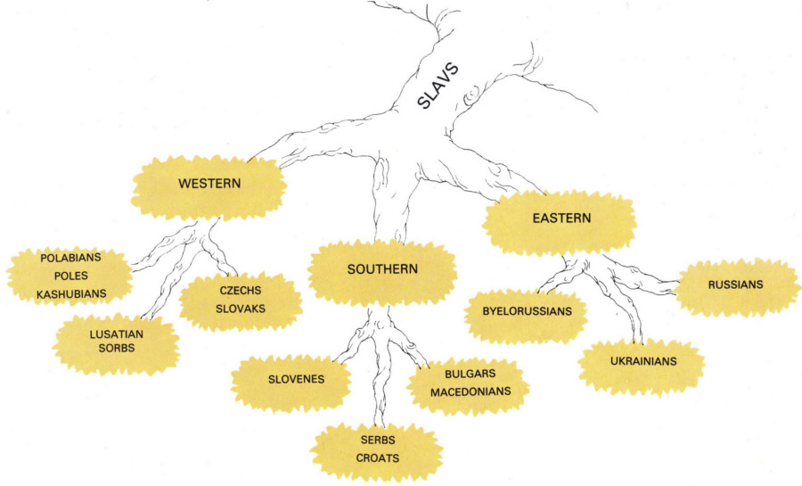Once the migration process of the Slavs and the consolidation of their new settlements was finished, differentiation occurred among the originally unified ethnic group, which split into three main branches — the Eastern, Western and Southern Slavs — and individual national languages began to develop.