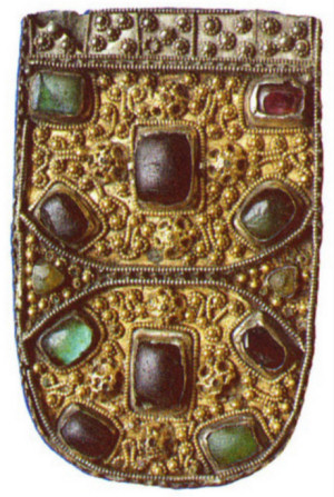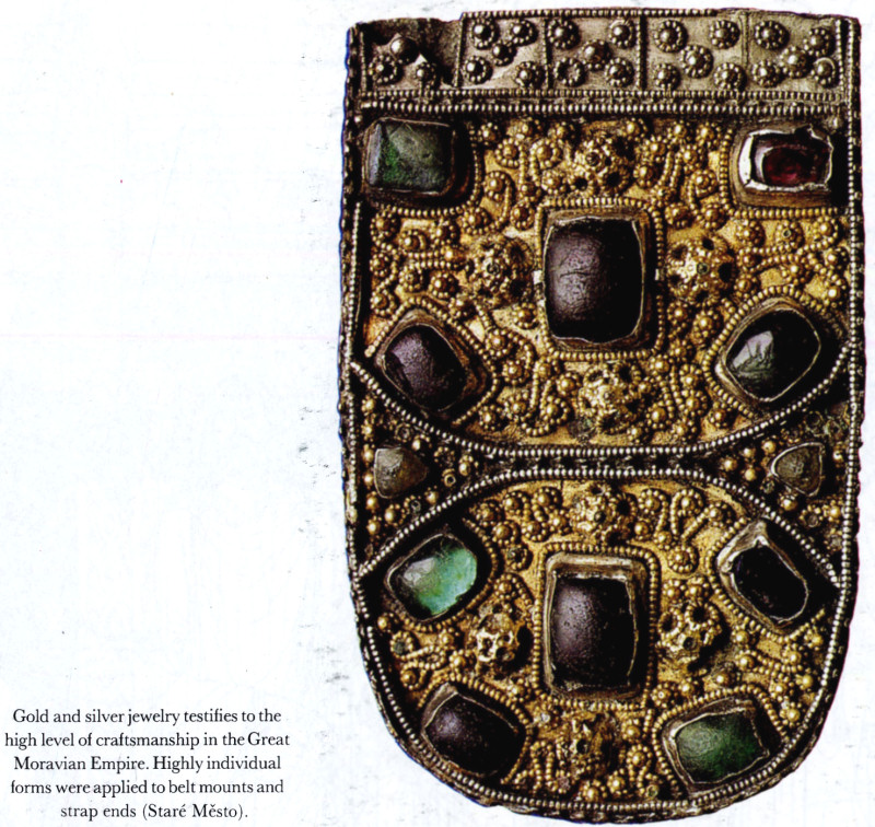 Gold and silver jewelry testifies to the high level of craftsmanship in the Great Moravian Empire. Highly individual forms were applied to belt mounts and strap ends (Staré Město).