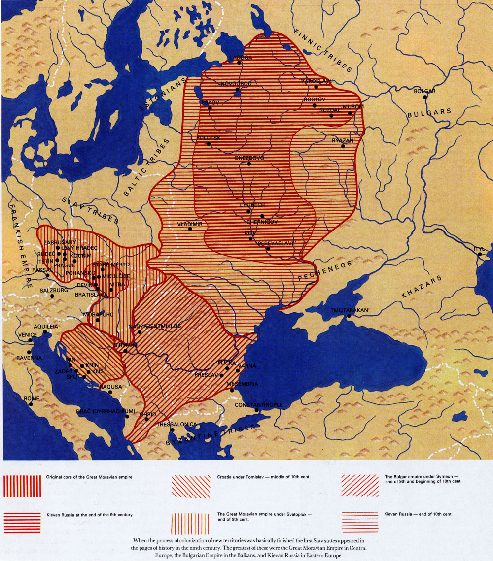 When the process of colonization of new territories was basically finished the first Slav states appeared in the pages of history in the ninth century. The greatest of these were the Great Moravian Empire in Central Europe, the Bulgarian Empire in the Balkans, and Kievan Russia in Eastern Europe.