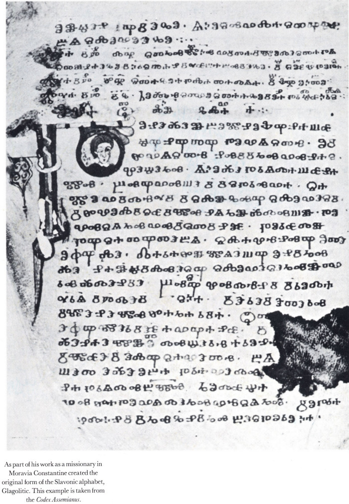 As part of his work as a missionary in Moravia Constantine created the original form of the Slavonic alphabet, Glagolitic. This example is taken from the Codex Assemiamis.