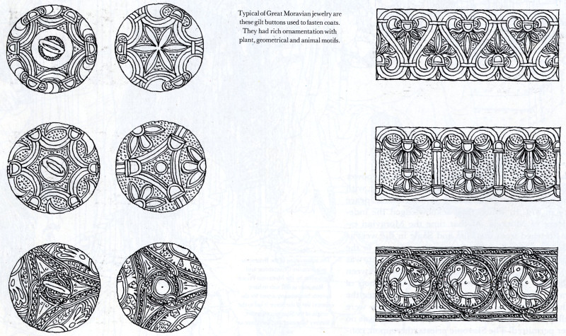 Typical of Great Moravian jewelry are these gilt buttons used to fasten coats. They had rich ornamentation with plant, geometrical and animal motifs.