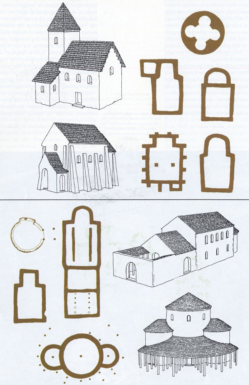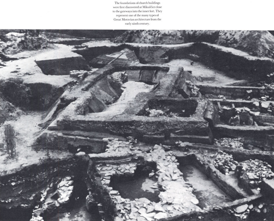 The foundations of church buildings were first discovered at Mikulčice close to the gateways into the inner fort. They represent one of the many types of Great Moravian architecture from the early ninth century.