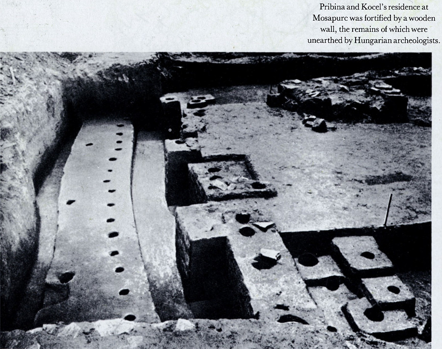 Pribina and Kocel's residence at Mosapurc was fortified by a wooden wall, the remains of which were unearthed by Hungarian archeologists.