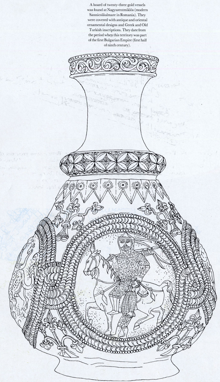 A hoard of twenty-three gold vessels was found at Nagyszentmiklós (modern Sannicolǎulmare in Romania). They were covered with antique and oriental ornamental designs and Greek and Old Turkish inscriptions. They date from the period when this territory was part of the first Bulgarian Empire (first half of ninth century).