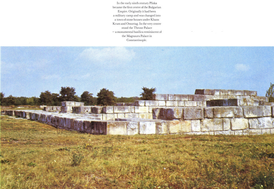 In the early ninth century Pliska became the first centre of the Bulgarian Empire. Originally it had been a military camp and was changed into a town of stone houses under Khans Krum and Omortag. In the very centre stood the Throne Palace — a monumental basilica reminiscent of the Magnaura Palace in Constantinople.