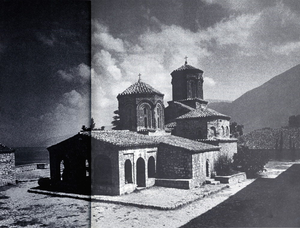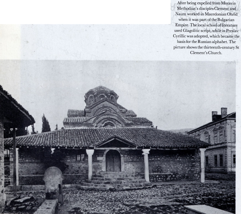 After being expelled from Moravia Methodius's disciples Clement and Naum worked in Macedonian Ohrid when it was part of the Bulgarian Empire. The local school of literature used Glagolitic script, while in Preslav Cyrillic was adopted, which became the basis for the Russian alphabet. The picture shows the thirteenth-century St Clement's Church.