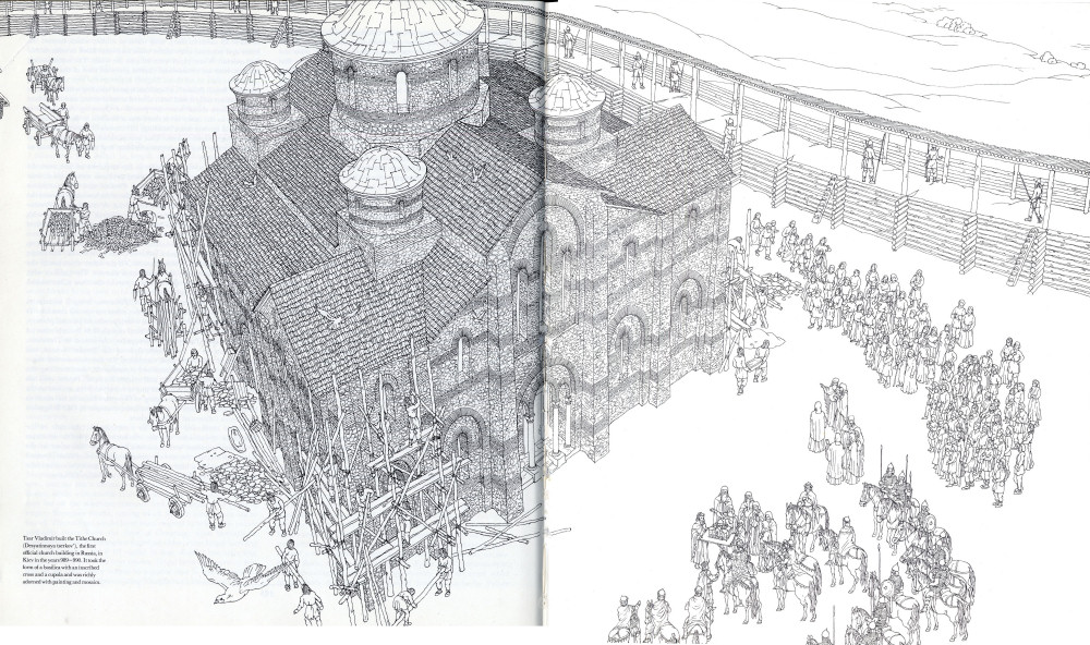Until the ascent to the throne of Vladimir the Great, Kiev Castle on Andreyev Hill was relatively small in size (2 hectares or 5 acres). Vladimir built a mighty and spacious castle with fortifications at the end of the tenth century, where his retinue of noblemen and boyars lived and, after the adoption of Christianity, the higher clergy lived too. Some time in the year 989 or 990 the Tithe Church (Desyatinnaya tserkov') was built in his residence, the first official church building in Russia, which,