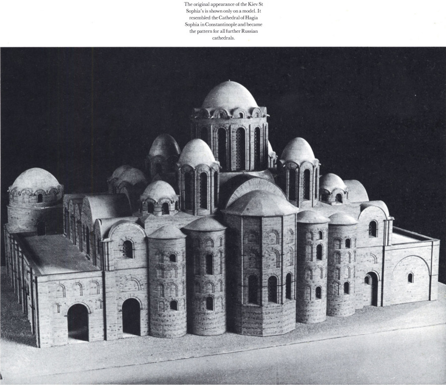 The original appearance of the Kiev St Sophia's is shown only on a model. It resembled the Cathedral of Hagia Sophia in Constantinople and became the pattern for all further Russian cathedrals.