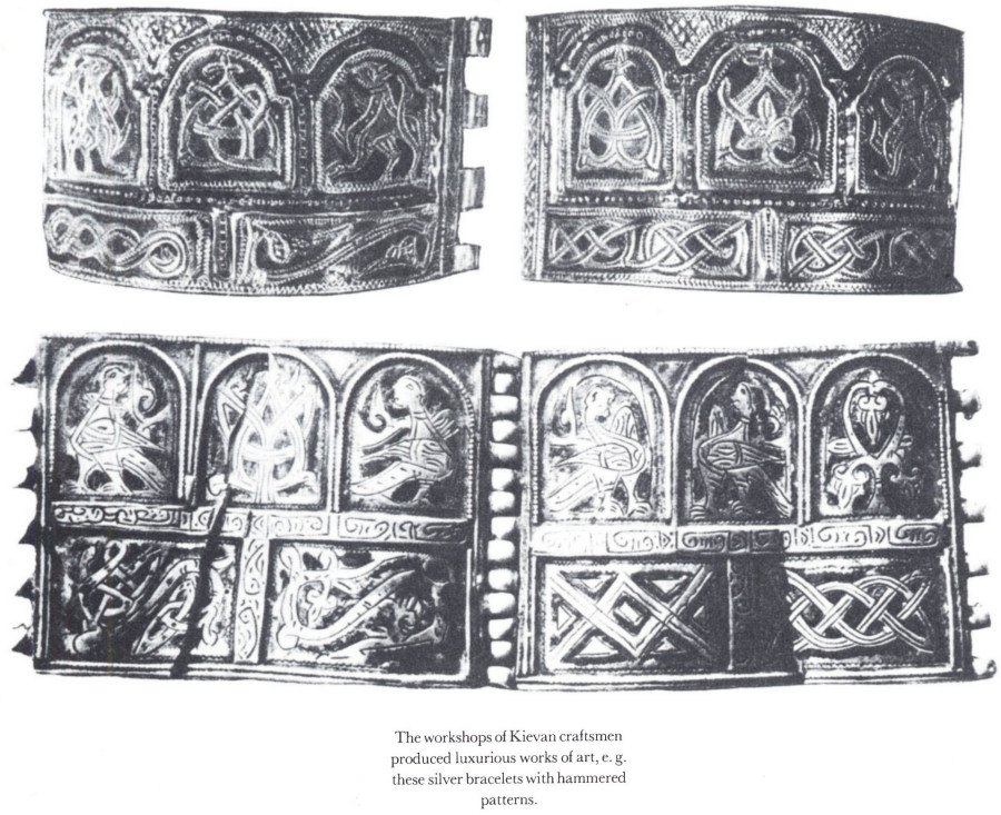 The workshops of Kievan craftsmen produced luxurious works of art, e. g. these silver bracelets with hammered patterns.