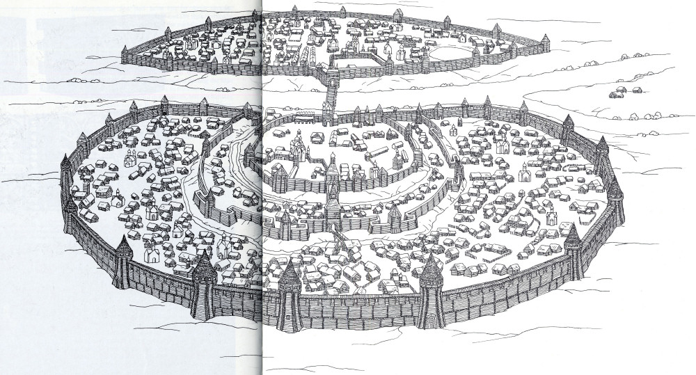In Ladoga, far to the north and known to the Scandinavians as Aldeigjuborg, a large group of Varangians settled. According to legend, the town was founded by Rurik himself with his retinue. There exist runic inscriptions, patriarchal houses of the Scandinavian type and kurgans with burials on ships according to Viking customs. Where the little river Ladozhka flows into the Volkhov, there was a busy harbour, which served for transhipment from sea-going to river boats. Later the big houses disappeared and their place was taken by smaller log cabins of tradesmen and craftsmen, as in Novgorod.