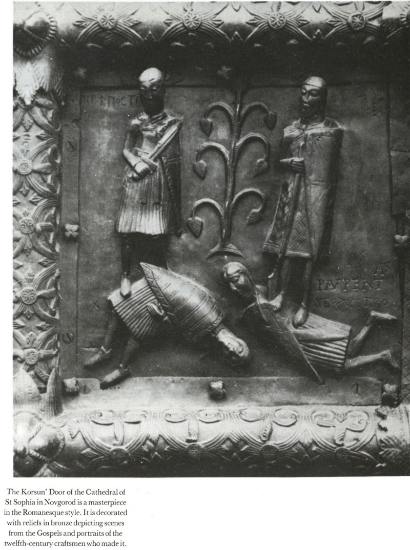 The Korsun' Door of the Cathedral of St Sophia in Novgorod is a masterpiece in the Romanesque style. It is decorated with reliefs in bronze depicting scenes from the Gospels and portraits of the twelfth-century craftsmen who made it.