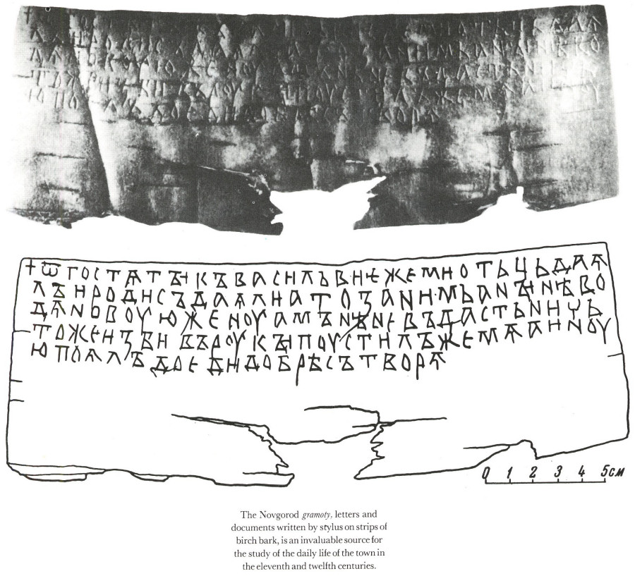 The Novgorod gramoty, letters and documents written by stylus on strips of birch bark, is an invaluable source for the study of the daily life of the town in the eleventh and twelfth centuries.