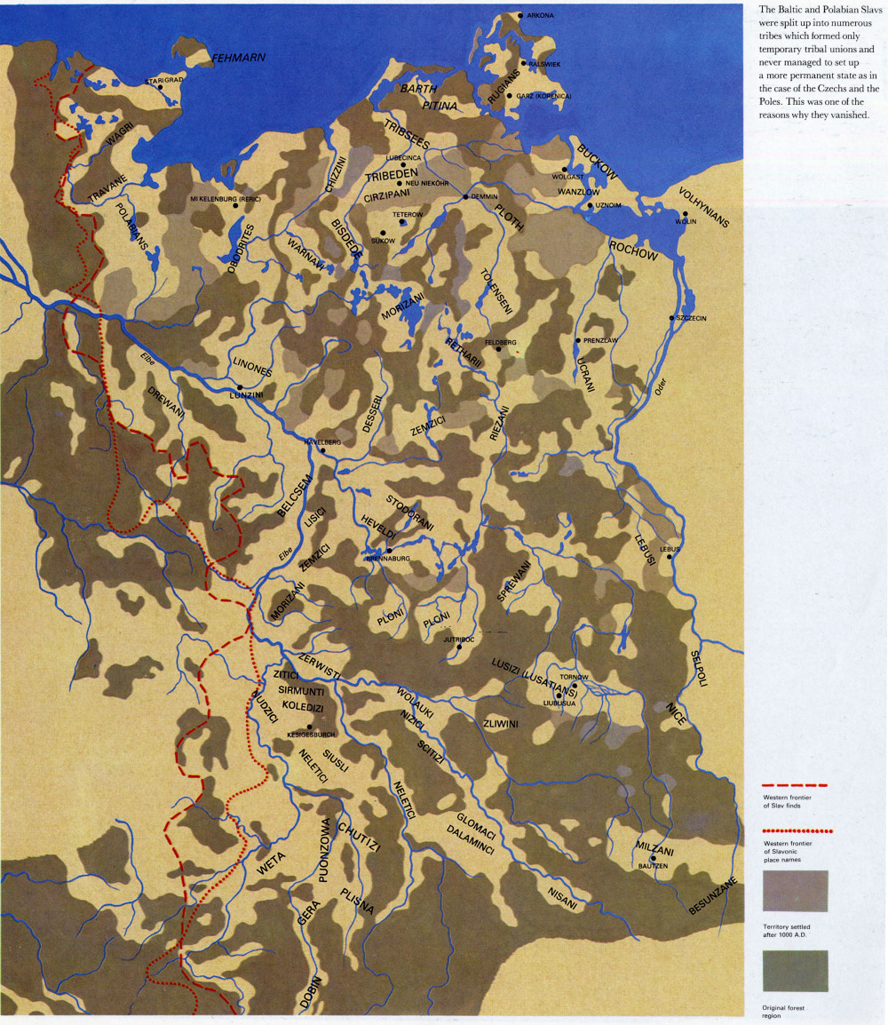 A considerable part of what is today German territory (basically the whole of the German Democratic Republic and a large part of the German Federal Republic as far as Holstein, Hamburg, Hanover, Thuringia and north-eastern Bavaria) was once settled by Slavs. Their tribes flooded this land after the Germanic tribes had moved on at the time of the migration of nations. The Slavs then led a century-long struggle for their independence against the renewed Germanic penetration to the East. This ended with the Slavs being subjugated, exterminated or Germanized. Today all that remains are very small numbers of surviving Lusatian Sorbs, but there are no traces of the Polabian or Baltic Slavs other than numerous place-names and sites investigated by the archeologists.