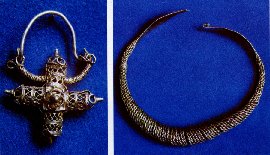 The beauty of the jewelry from the region of the Baltic and Polabian Slavs in no way lags behind goldsmiths' work in the neighbouring Slav countries. This is proved by silver filigree ear-rings in the form of a cross and by a plaited necklace from Niederlandin near Angermünde (eleventh century).