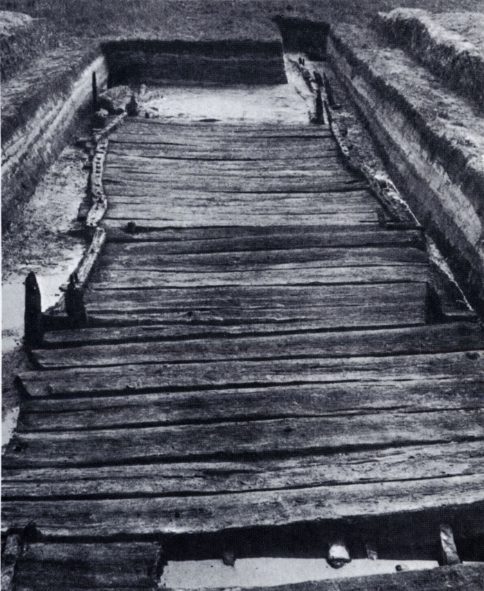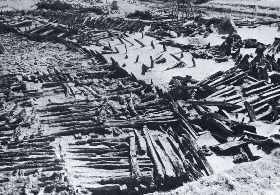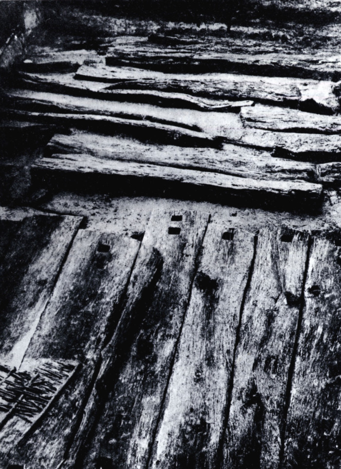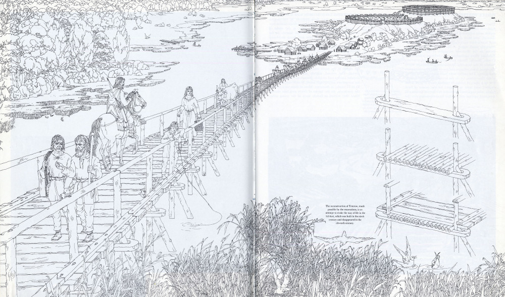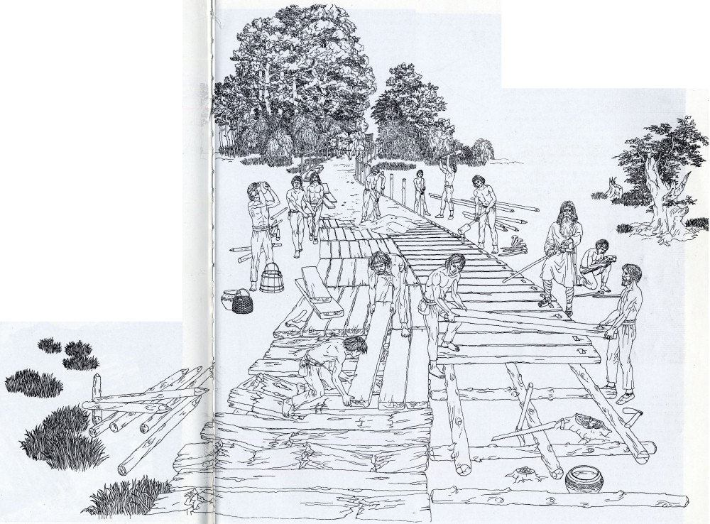 Hill-fort Alte Burg near Sukow is one of the most ancient in Mecklenburg. Here was a chance to gain an insight into the manner of road building. There was a timbered road, 1,200 metres (over 1,300 yards) long, that linked the castle hidden on a hillock in the bog with the unfortified settlement. The timbered way has survived in excellent condition in the wet soil. It was rebuilt on several occasions. The most interesting alterations date from the period when the castle was the centre of an estate with a whole group of settlements. There was a substratum of tree trunks laid crosswise on top of one another. On this lay thick, broad, painstakingly cut planks, which were attached with oak posts to the surrounding terrain along the edge. The result was a road of double width strewn with fine sand which rose half a metre (nearly two feet) above the boggy land as a causeway. It was possible for two wagons to use it to go simultaneously in and out of the castle. In this more recent form the road served until the castle was abandoned, when it became overgrown and has thus survived in almost its original form. All this must have taken place in the eighth to ninth century. To judge by finds of undecorated pottery typical of the older hill-forts and their settlements in Mecklenburg, Sukow fortress might even date back to the seventh century.