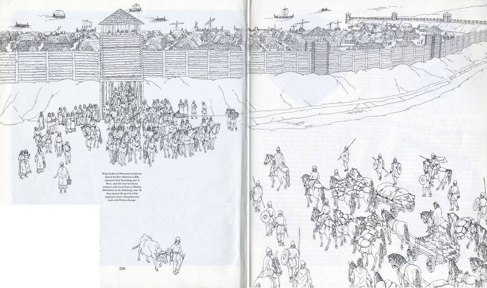 King Godfred of Denmark invaded the land of the Slav Obodrites in 808, destroyed their flourishing port of Reric, took the local merchants prisoners and moved them to Hedeby (Haithabu) on the Schleswig coast. He thus ensured the growth of this important centre of Scandinavian trade with Western Europe.
