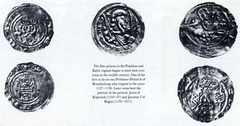 The Slav princes in the Polabian and Baltic regions began to mint their own coins in the twelfth century. One of the first to do so was Pribislaw-Heinrich of Brandenburg who reigned in the years 1127-1150. Later coins bore the portrait of the princes: Jazca of Kopenick (1153—57) and Jaromar I of Rügen (1170-1217).