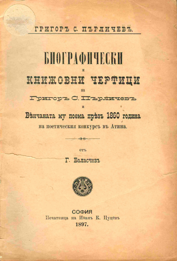 Биографически и книжовни чертици на Григоръ С. Пърличевъ, и Вѣнчаната му поема прѣзъ 1860 година на поетическия конкурсъ въ Атина отъ Георги Баласчевъ