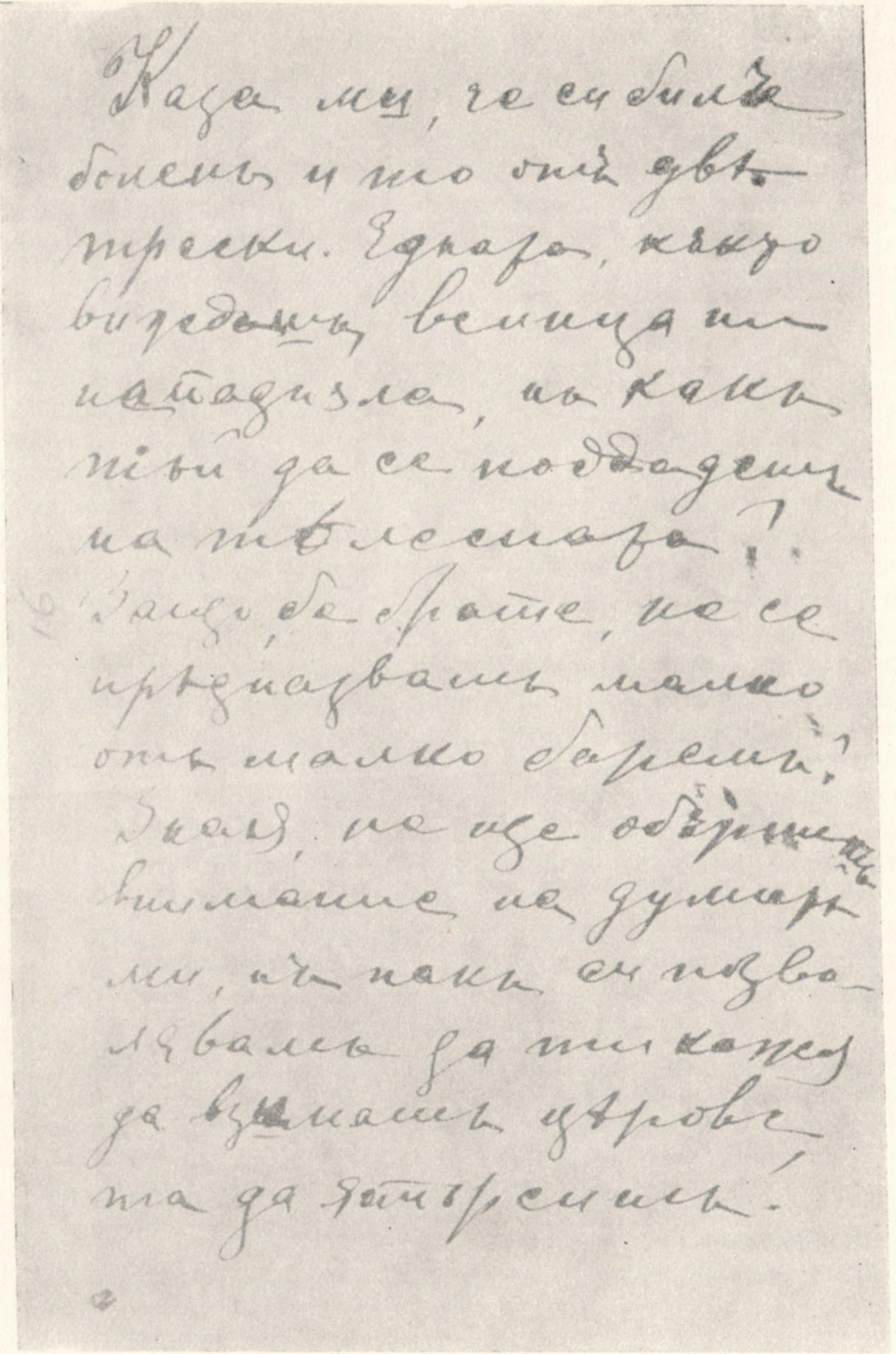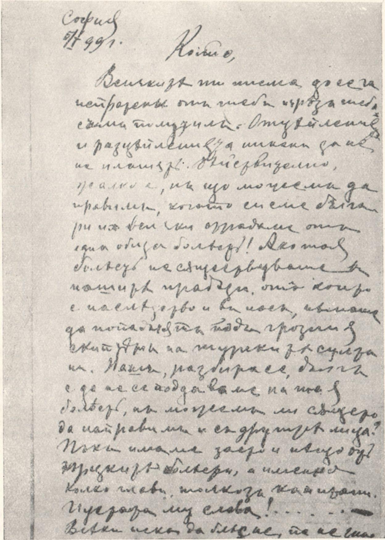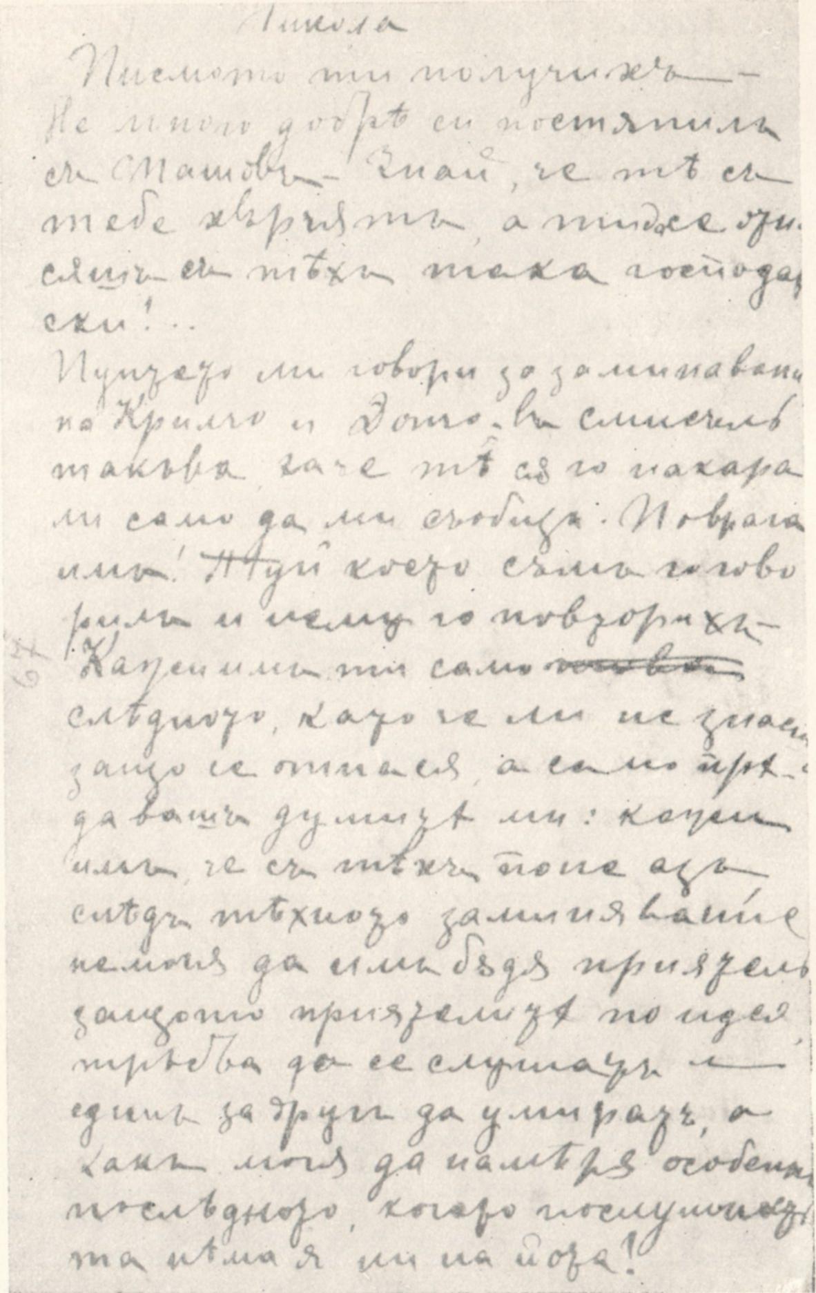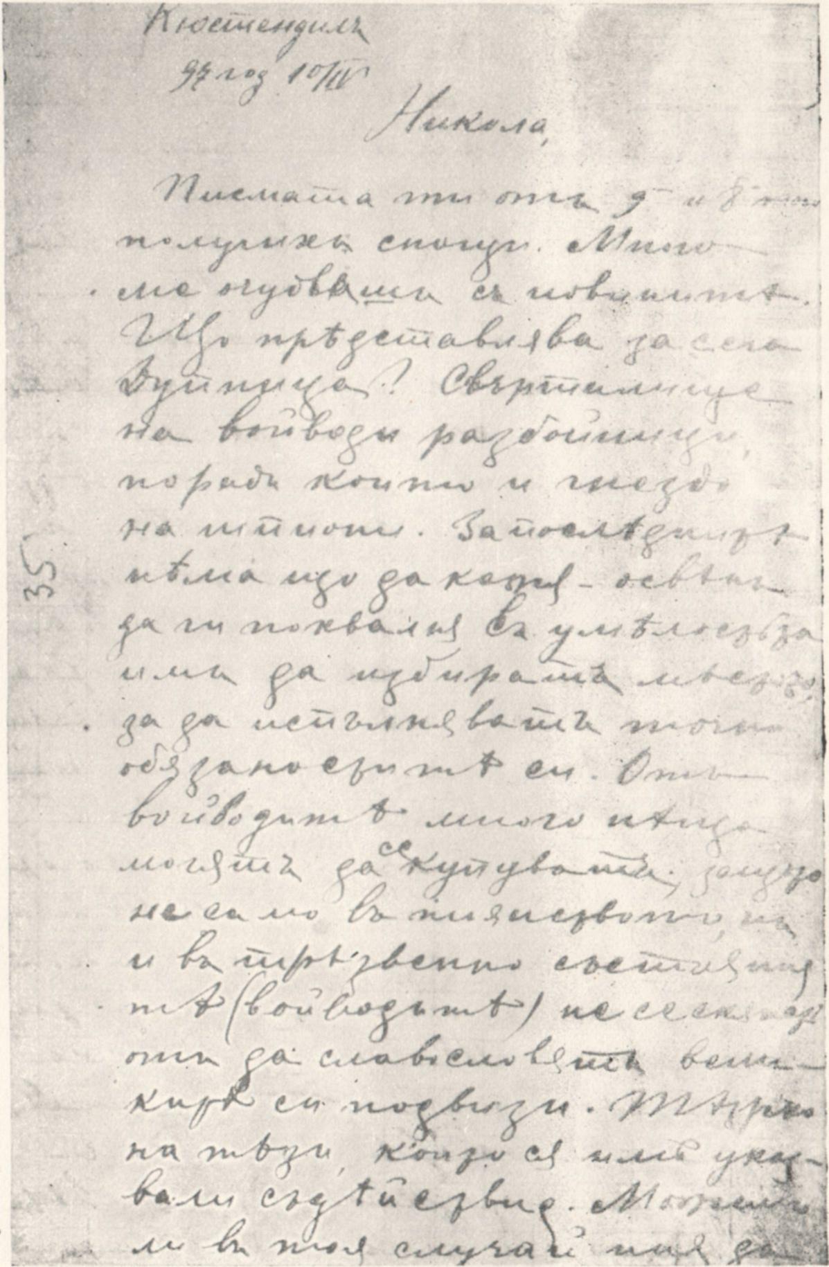 да ме известиш дали писмото ми от София с 115-те зл. левове си приел или не. Наистина с телеграмата и с писмото ти от 1и того извести ме, но това известие беше прибързано, защото моето писмо ти требва или требваше да го получиш, след като си предал и писмото, и телеграмата на пощата. За да се обясним, побързи веднага да ми пишиш или телеграфически ми отговори получи ли писмото ми от 29и м. м. с парите или не.