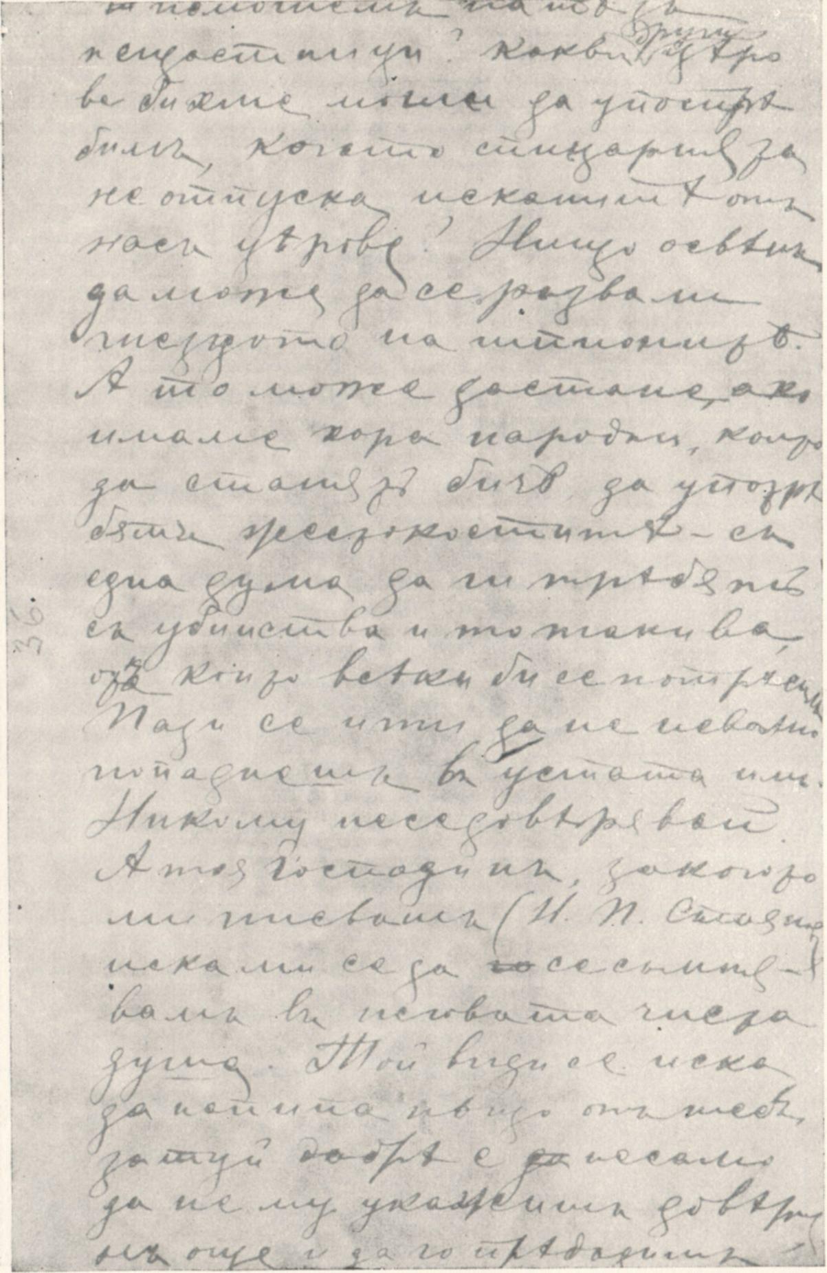 Пратили ли са братя Иванови друга пратка след тая от 260-те? Загатваш ми за некой си уловен шпионин, без да ми дадиш некакви подробности по неговото изследвание. Ния сме окръжени с цел полк от такива народни приятели, но кой може се занимава с тех. В задачата на ви[с]шите патриоти не влиза гонението на вредните елементи, затуй и ви[с]шисти, и патриоти, и патриотчета не щат и да знаят кои са и какво работят шпионите— тех занимава[т] велики задачи, оттам и немаранието им към предателите. Жалко! Но що да правим, когато сами ния нищо не можем да свършим всички работи.