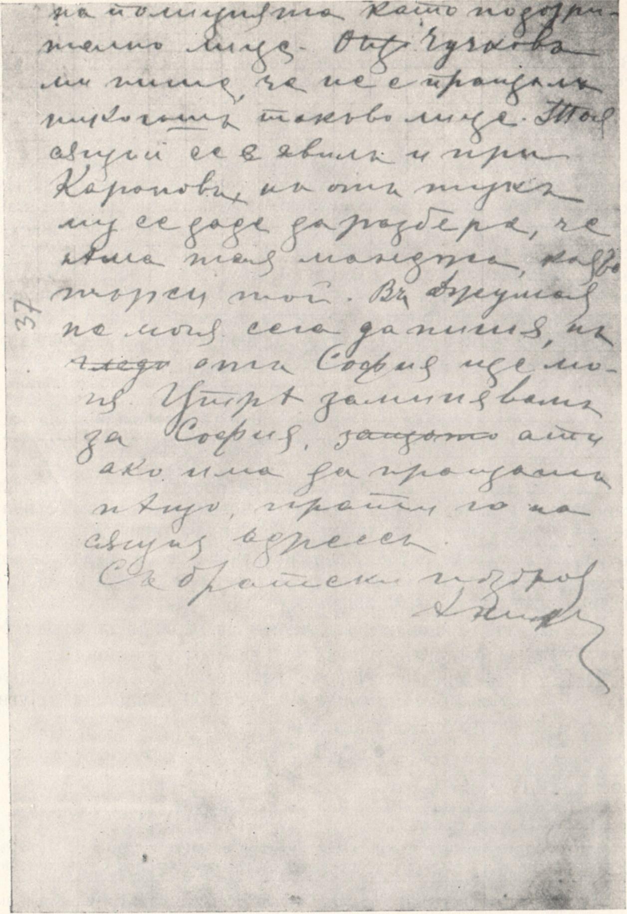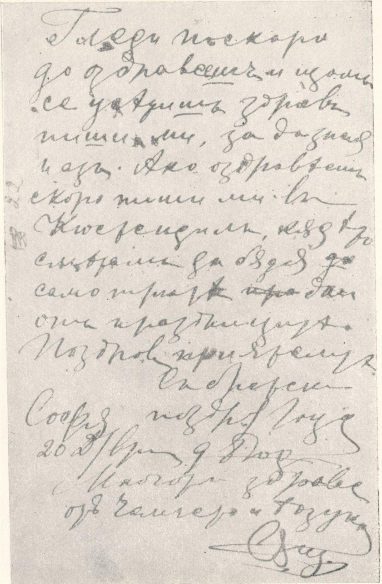 Обещах да дода тези дни, но важна работа ме застави да отложа идванието за неколко, а може би за десет дни. Досега не сме проводили нищо, понеже кираджии немаме; за да можем редовно да изпращаме, требвало би да се намерат поне две кола, които редовно да пренасят вещите, а тая длъжност могат изпълнява само хора твърди и тайнствени; [1] ако намериш такива, прати до мене с писмо, които могат ме намери или в „Братя Иванови”, магазина, или пък в кафене „Нил” или гостилница „Балкан”. Не мога поверя пренасанието на непознати хора, че вчера се случиха нежелателни работи с преносвачите в Кюстендил. За да има сигурност, требва да имаме наши хора. Снощи бех при Морфов [2], той не е направил никаква постъпка, но обеща днес да иде при Гешева [3] — бакалъм.