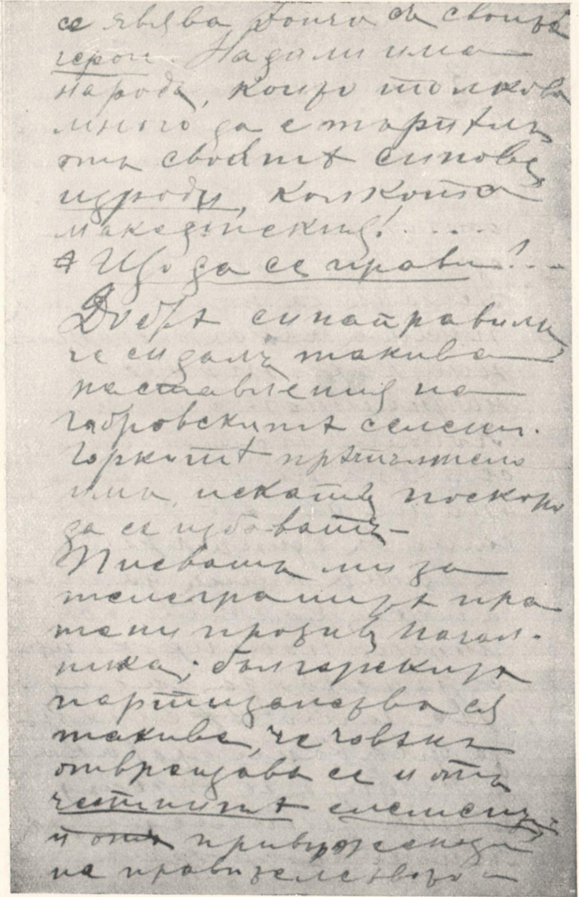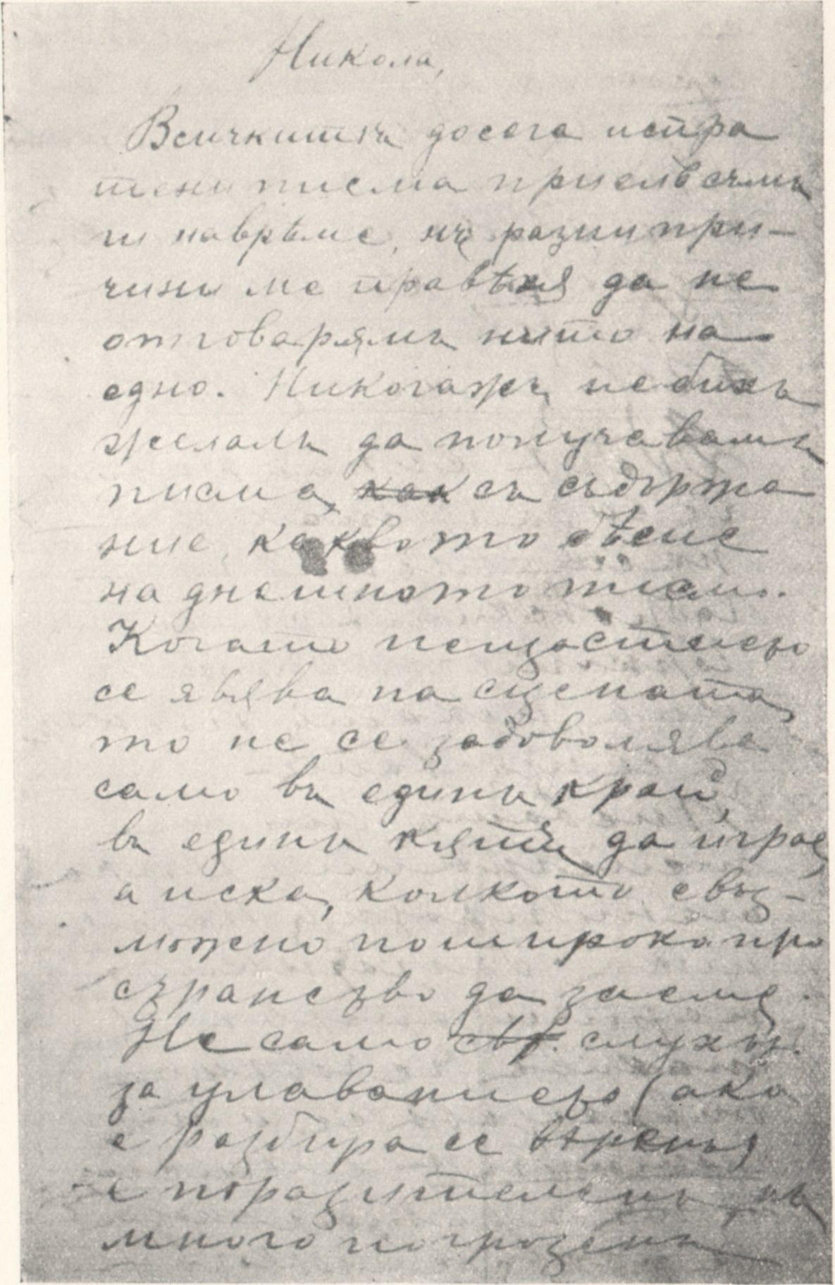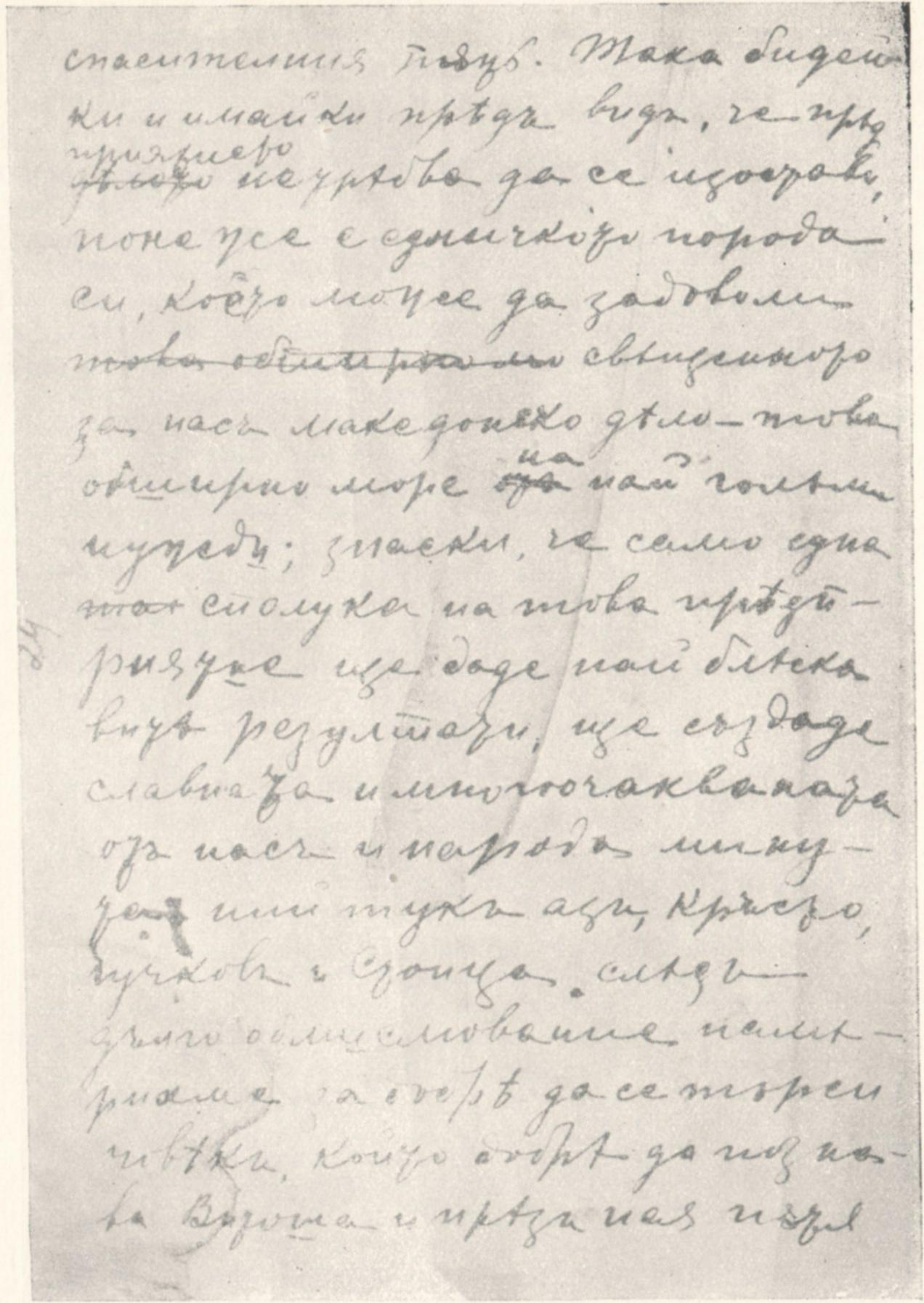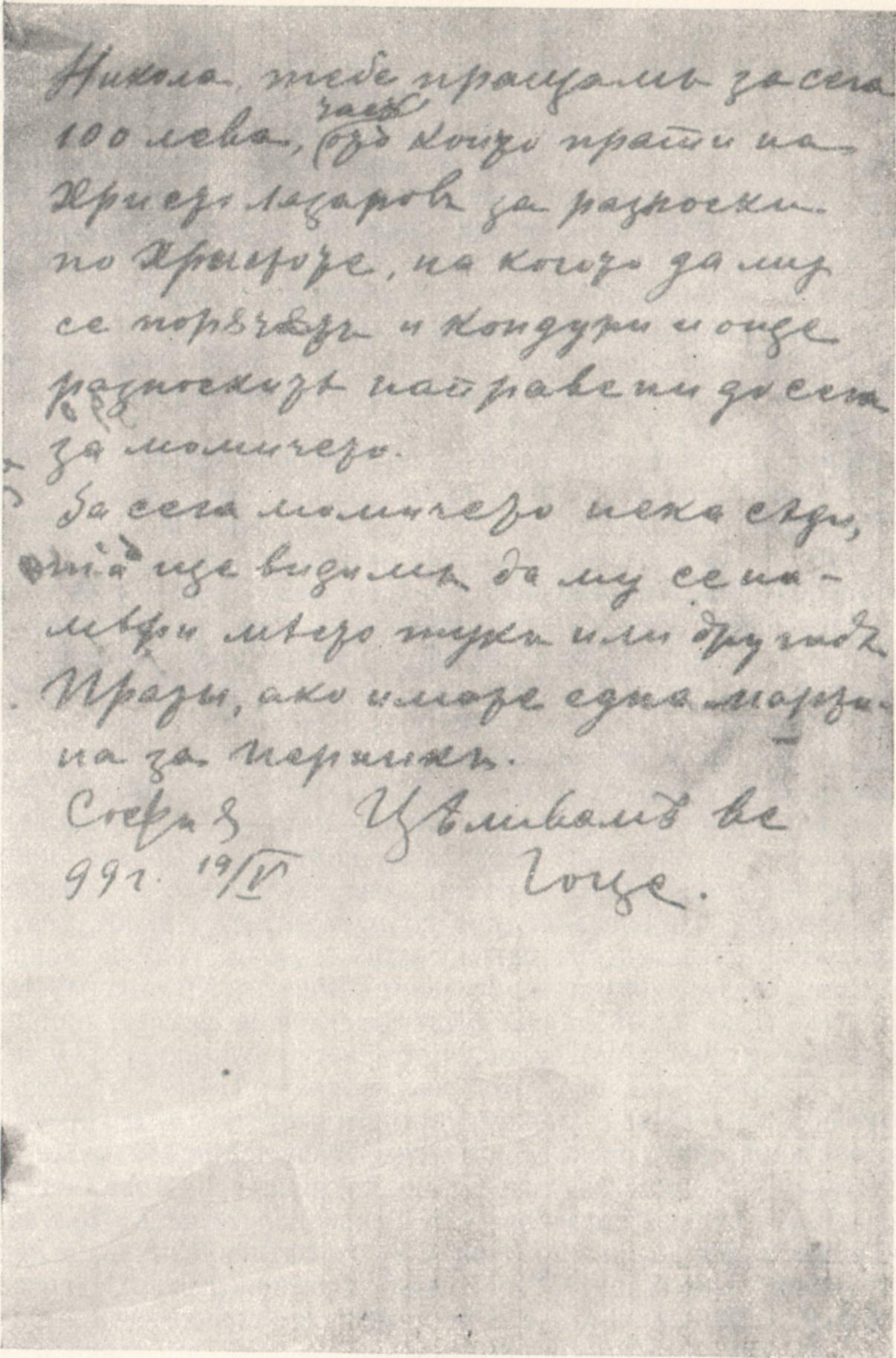 Требва да знаеш, че аз и Гйорче не отиваме во комитета [2]. Не стъпваме там, където безсъвестността е достигнала дотам, че со демонска усмивка да ти се радват на жестоките удари, [3] нанесени от турската власт на организацията, вследствие на което им се удало възможност да завземат положението (?!). Поставям въпросителна, защото е още въпрос. Но сега нам требват пари, за да можем извърши най-важни работи, особено там, където е най-много разстроено. Откъде да ги вземем, [х]ич не знам. Ще се обърнем към Джумаята, за където и приключвам тук едно писмо. А докато изпратат оттам, веднага щом получиш настоящето, изпрати кисията, която ти оставих со неколко наполеона вътре. Гледи час по-скоро да ги изпратиш, че времето е най-скъпо, особено за работата, която сметаме да вършим. А не бави и писмото за Джумаята, ако можеш още същия ден или същата вечер да го пратиш и носителя никак да го не държи во себе си.