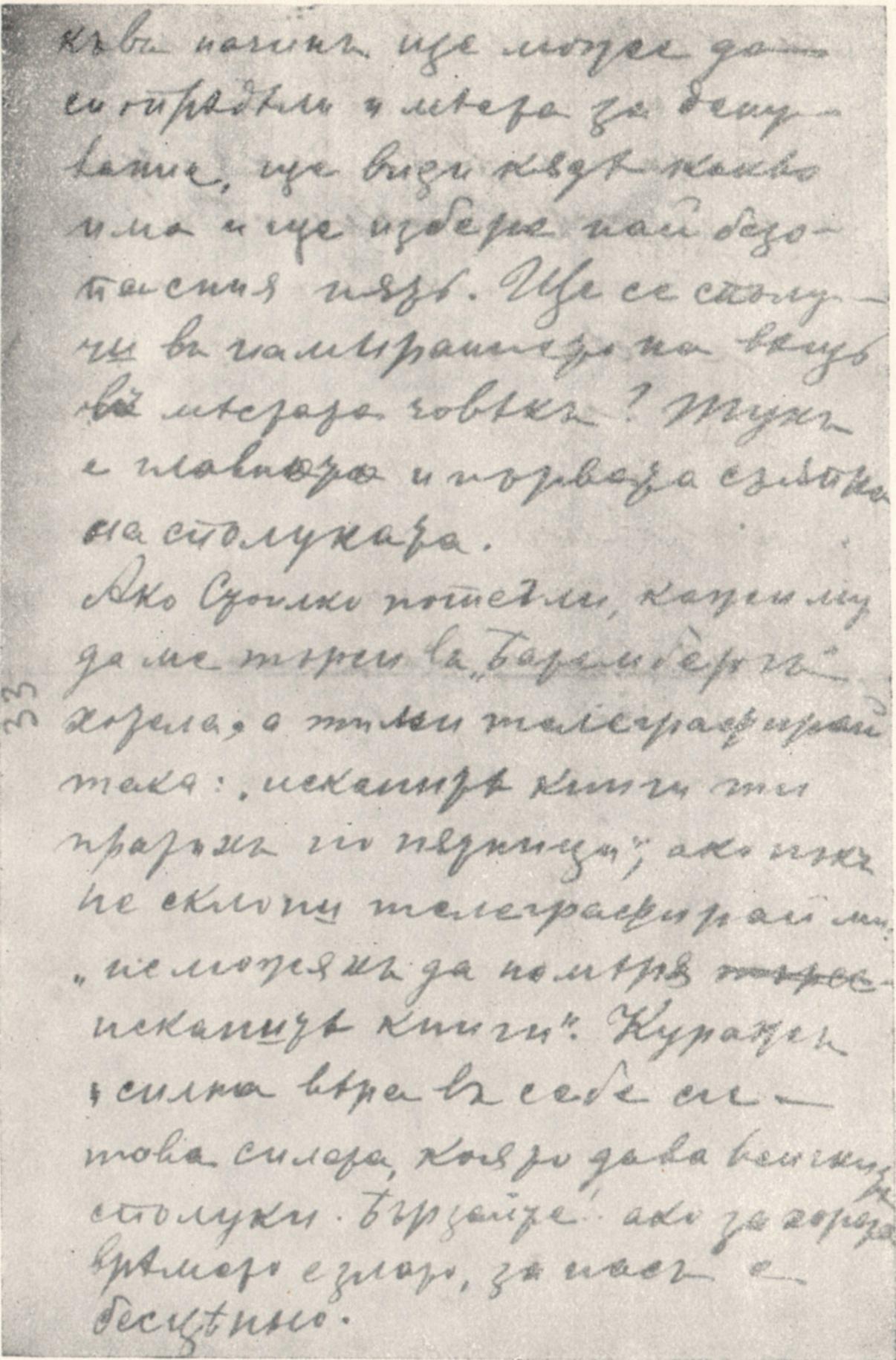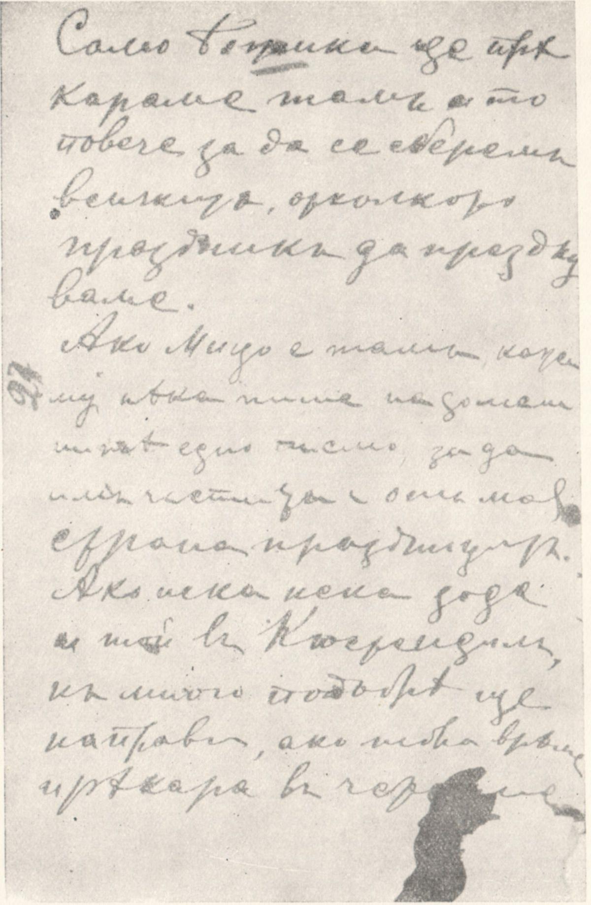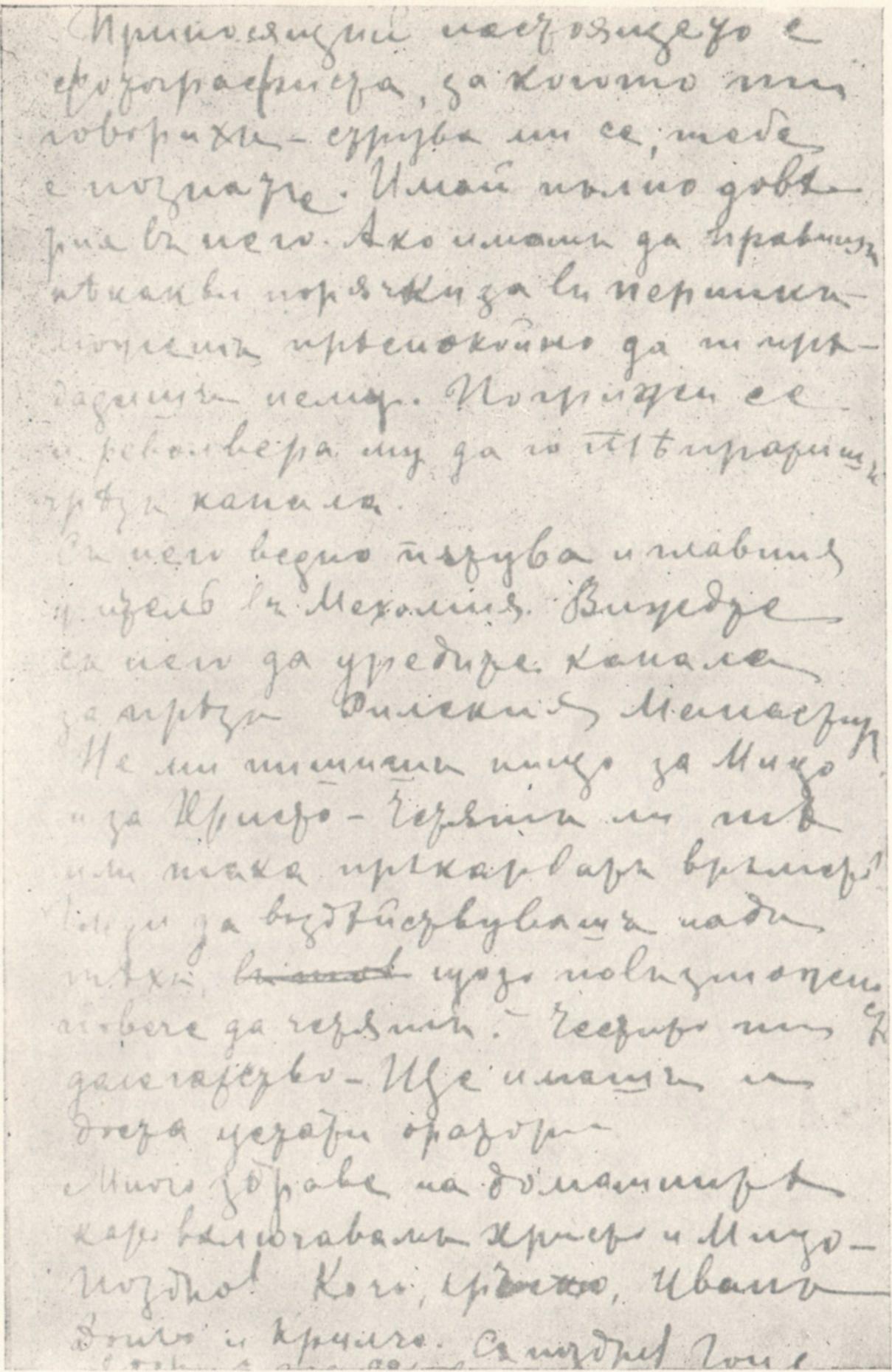 Чудни са хората, но още по-чудни се явяват тез господиновци, които с своето писмо, пълно с нелепости, отправено до Иванови, правят човек да се пръсне от яд. Сега вече вервам да са се помирили с положението си и са почнали редовно да ти предават дългите. Гледи колкото е възможно по-скоро да се изнасят. Защото не може човек да предвиди шарлатанството на хората. Добре ще бъде, [1] ако подшепниш на началника, че сме прекарали през тези дни около петстотин килограма прах [2] за бомби и по един изкусен начин, без да те сети, да го подканиш да съобщи туй Морфову [?]. Знаеш целта на тая лъжа.