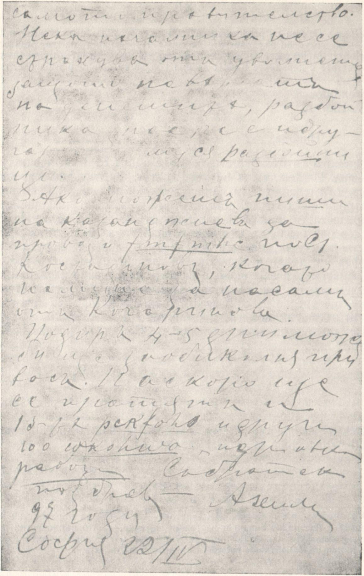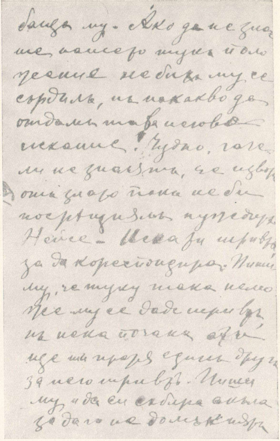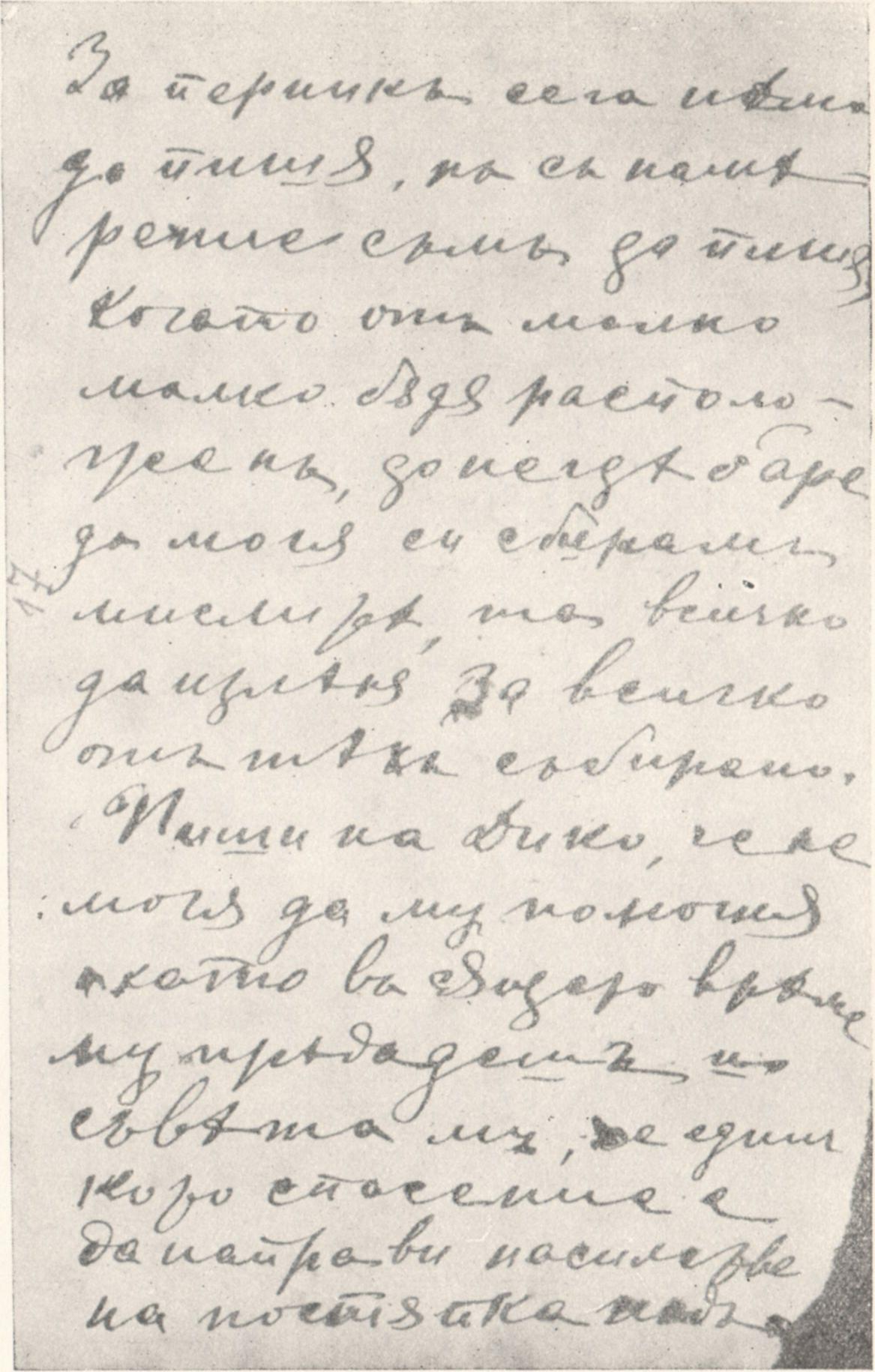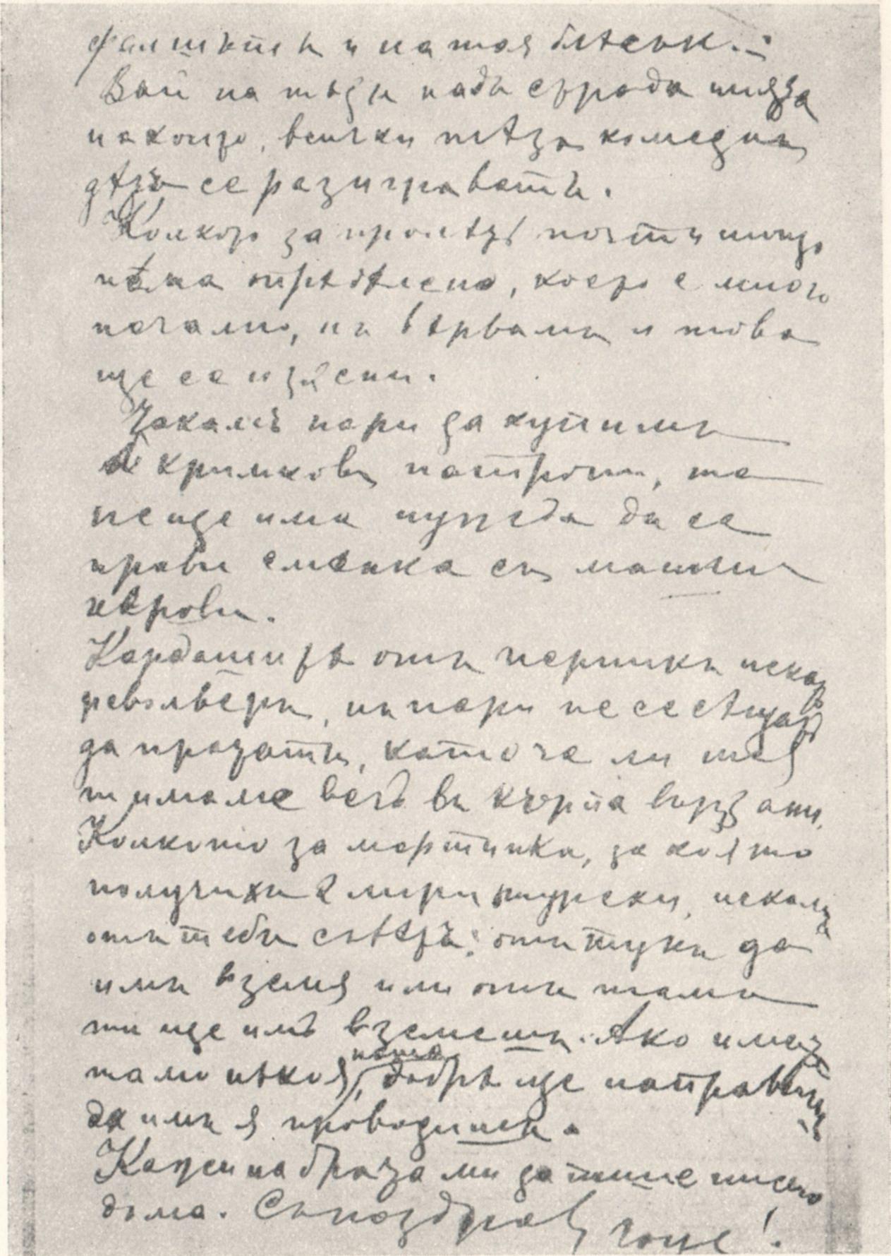 Чудни са хората, но още по-чудни се явяват тез господиновци, които с своето писмо, пълно с нелепости, отправено до Иванови, правят човек да се пръсне от яд. Сега вече вервам да са се помирили с положението си и са почнали редовно да ти предават дългите. Гледи колкото е възможно по-скоро да се изнасят. Защото не може човек да предвиди шарлатанството на хората. Добре ще бъде, [1] ако подшепниш на началника, че сме прекарали през тези дни около петстотин килограма прах [2] за бомби и по един изкусен начин, без да те сети, да го подканиш да съобщи туй Морфову [?]. Знаеш целта на тая лъжа.
