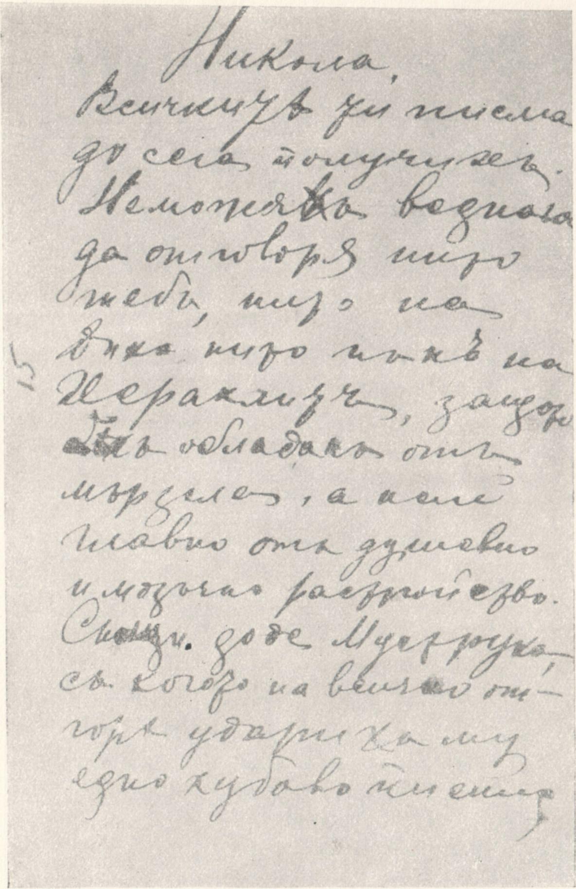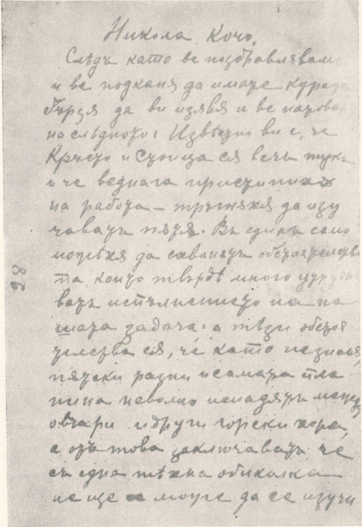 Днес пристигнах тук и веднага се срещнах со Никола Иванов, който силно се възмутил от писмото ми. Туй и предполагах. Со настоящето искам да те запита[м] дали можеш во най-скоро време да намериш шест кола отведнъж. Коларите им да са тайни, та да може во един ден да дойдат во Брезник — като ги натоварим, да върват право на границата. Само по такъв начин ще можем да ги дигним тез пушки, и то за скоро време. Затова погрижи се и веднага ми съобщи.