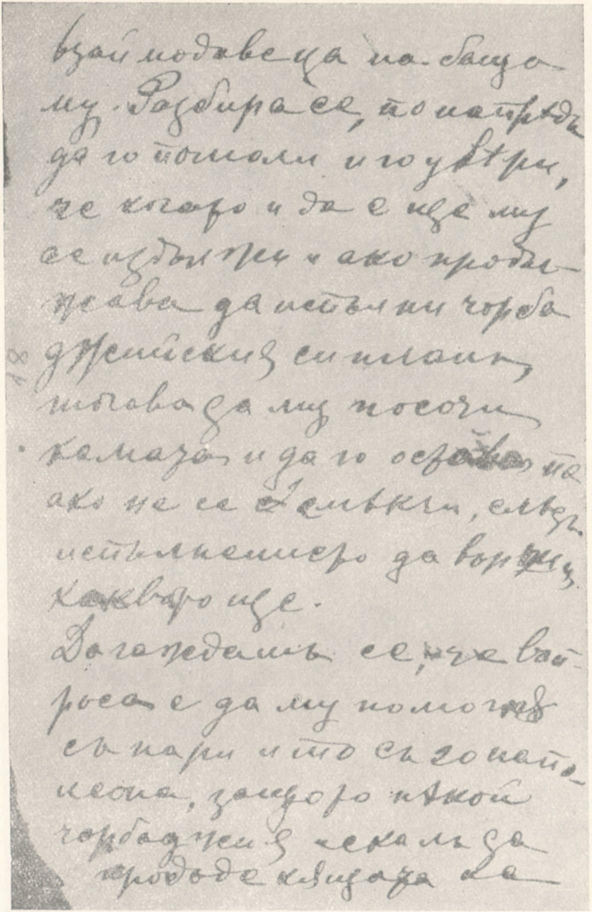 Вчера получих писмото ти, с което много ме зарадва, като ми съобщаваш, че пренасанието се е почнало и даже некои материали минали благополучно. Не остава нам друго, освен да гледаме колкото е възможно по-бърже и в по-големи суми да минават. Може би досега да са пристигнали изпратените 400, които беха натрупани като тояги в колите. Не е възможно да се пращат по десет в чувал, защото немаме работа с хора, които от сърце искат да услужат, затова тая грижа ще се стовари пак на теб. Приключвам тук един банкнот от 100 лева златни, с които ще посрещнеш [?] разноските.