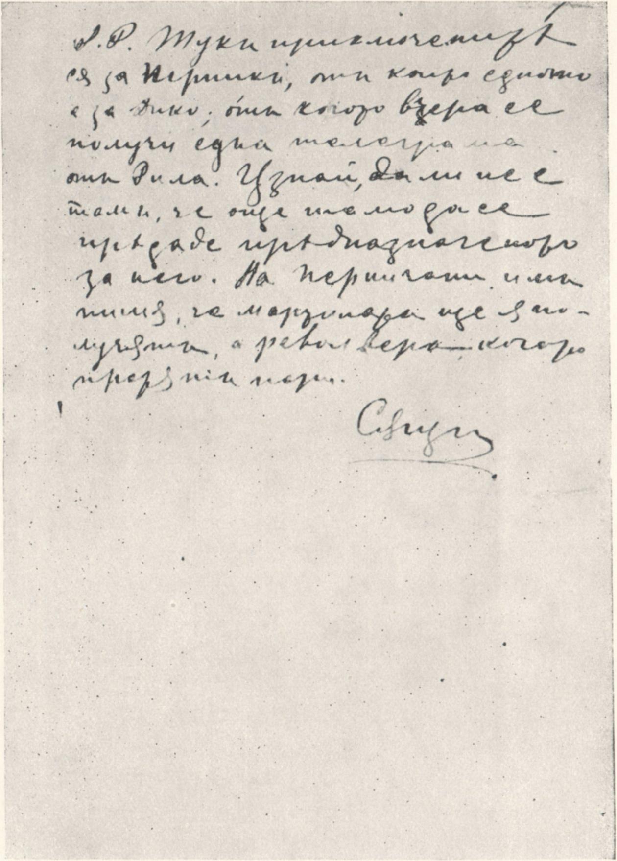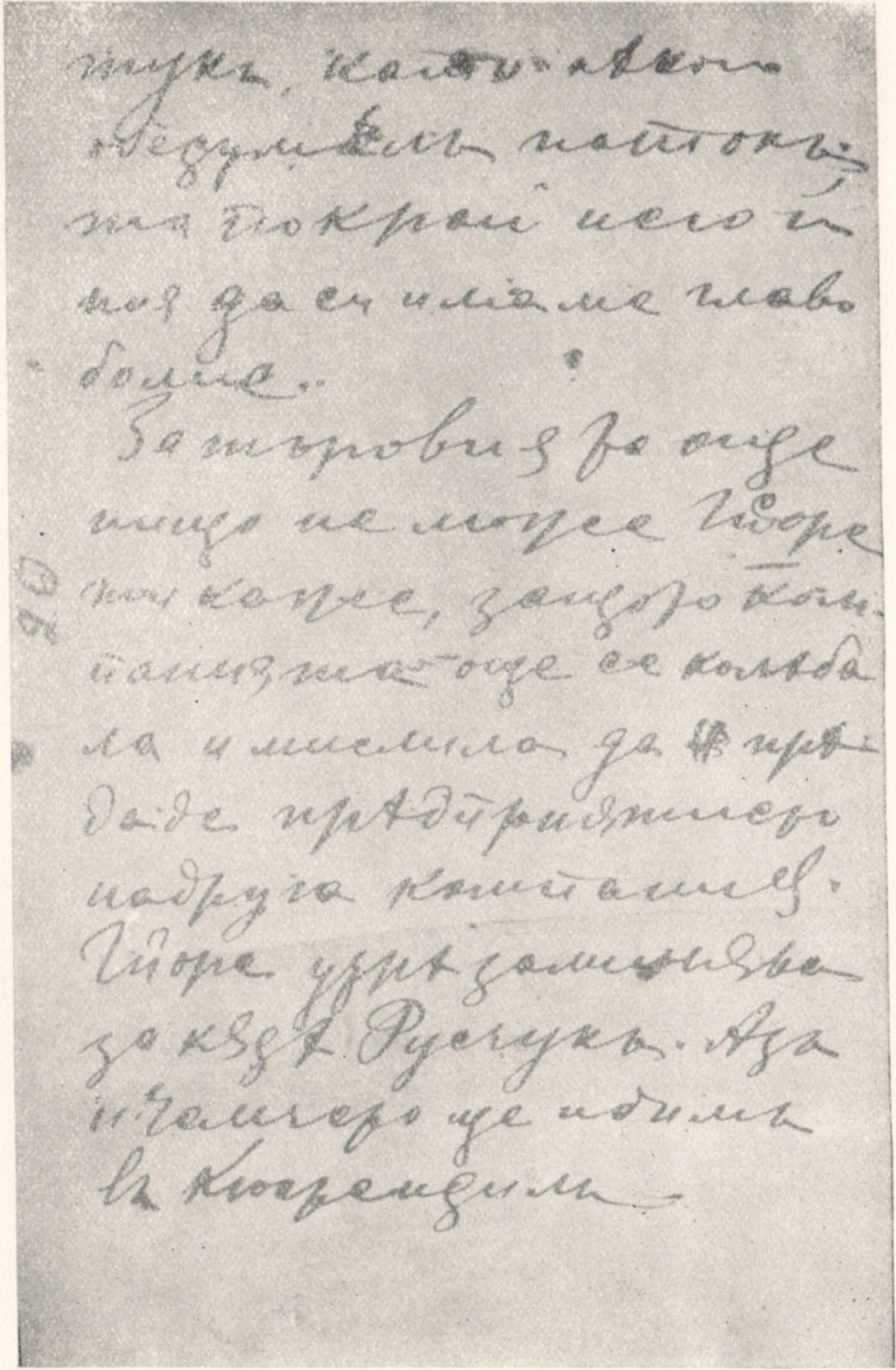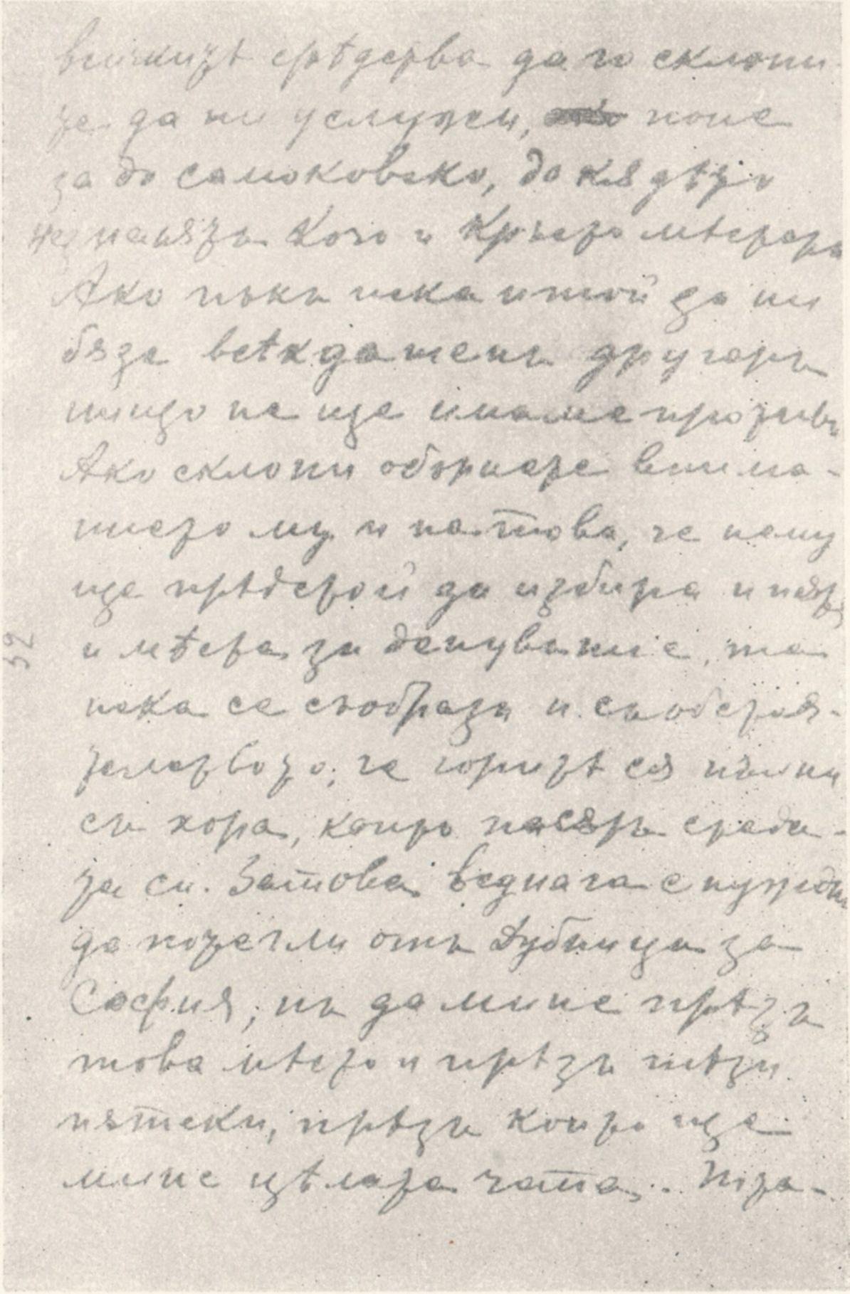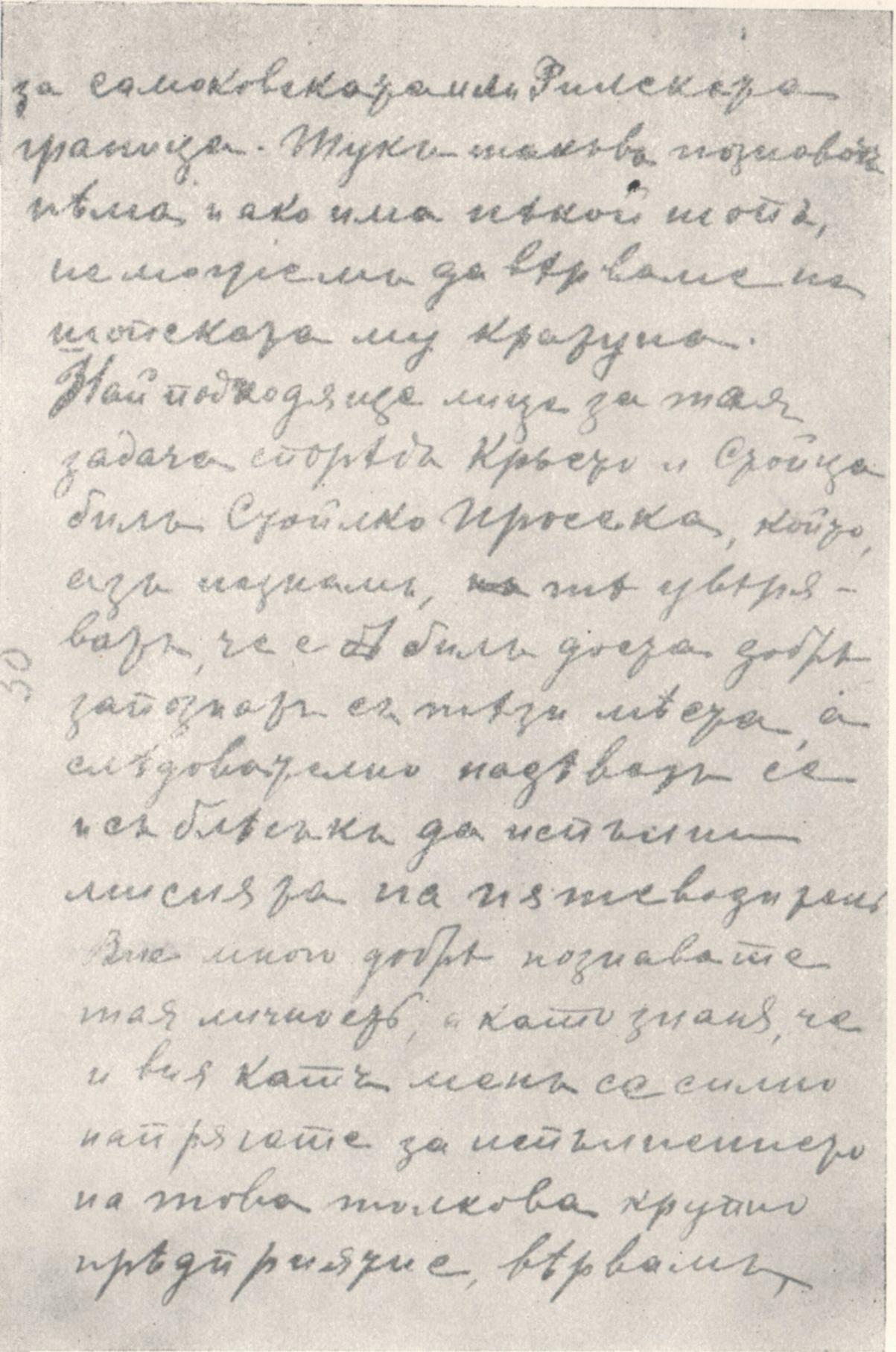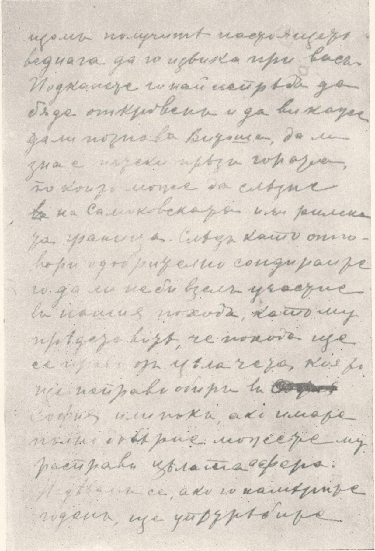 Тук приключеното веднага препрати в Борово [1], откъдето според както ми писват, щел да пристигне куриер. Вервам сега да е там. Дай му наставления да не изпадне в ръцете на некои генералски шайки [2], че и самото писмо е с шифровка, позната на правителството. Аз не знам защо досега не са изменили шифъра; а също не знам защо и ти досега не си потърсил