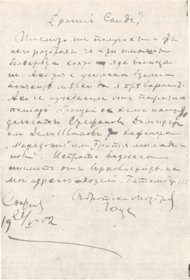 Скоро Димитър Стефанов ще доде при теб и ако требват пари, ще ти даде. Той е делегат на Вътрешн[ата] организация. Прати и равносметка за купените досега материали. Прати нам карабината, която си купил за Лимончев [2]. Той я отстъпва. Оная, за която искат 100 лева, недей я купува, защото е доста скъпа. Всички гюрултии за некакво въстание в Македония е лъжа. [3] Обаче дали не ще бъде изнасилено от тука вътрешното население, не знам.