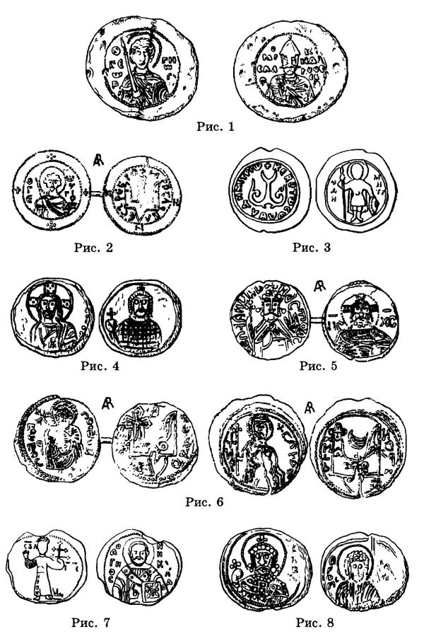 И. И. Толстой в работе 1893 г. привел многочисленные аналогии, призванные продемонстрировать зависимость типов монетного Чекана Владимира Святославича и Святополка Окаянного от монетных типов Византии X - начала XI вв. [23] Между тем, собранные позднее материалы византийской сфрагистики самым убедительным образом свидетельствуют о непосредственной зависимости исходной композиции древнерусской монетной чеканки (златников и сребреников Владимира «I типа») от византийской императорской печати X в. Эти печати несут на одной стороне изображение императора с регалиями власти, а на обороте - поясную фигуру Христа [24]. Именно так оформлены первые выпуски монет Владимира Святославича: на одной их стороне помещено изображение князя, а на обороте - поясная фигура Христа. Весьма примечательно, что, если на протяжении почти всего X в. император на печатях сжимает в правой руке державу, то при Василии II и Константине VIII (976-1025) на место державы помещен крест на длинной рукояти. Именно такой крест в правой руке князя изображен на златниках и сребрениках Владимира «I типа» [25].