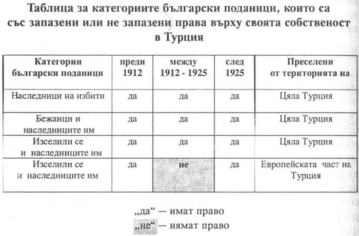 Таблица за категориите български поданици, които са със запазени или не запазени права върху своята собственост в Турция