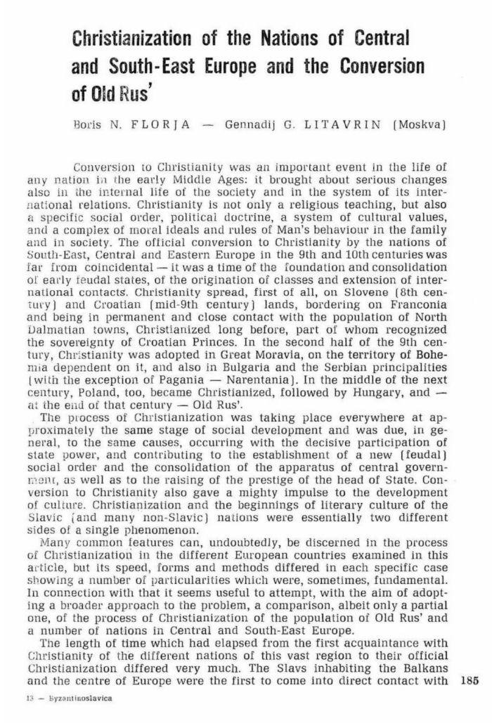 Boris N. FLORJA — Gennadij N. LITAVRIN (Moskva): Christianisation of the Nations oj Central and South-East Europe and the Conversion oj Old Rus’ 185
