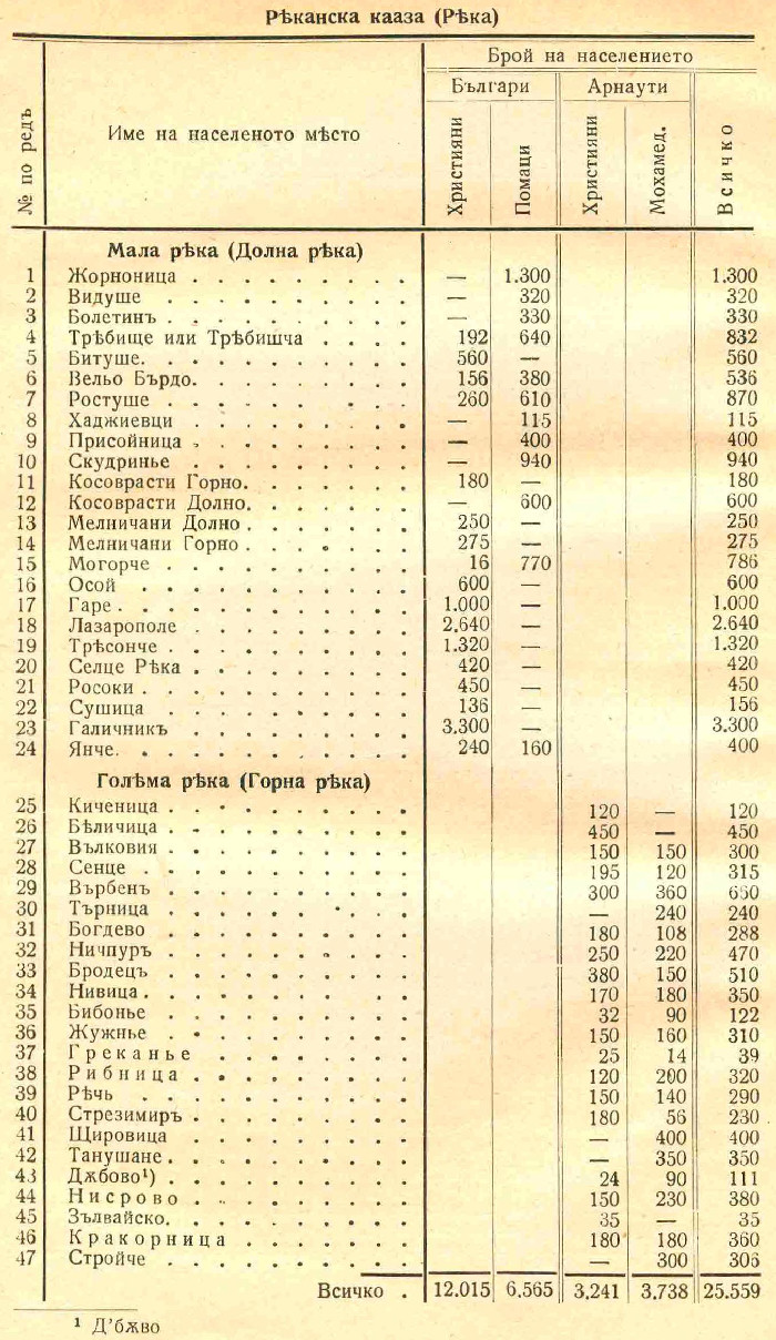 Селищата въ Голѣма Рѣка сѫ всички почти албтнизирани — говорятъ албански и едни сѫ още християнски, a други мохамедански. A селата въ Мала Рѣка сѫ чисто български, като едни сѫ християнски, a други помашки. Цѣлото население на рѣканската околия брои 25,559 души, отъ които християни (българи) 12,015 души, помаци (българи) 6,565 д.; християни (арнаути) 3,221 д.; мохамедани (арнаути) 3,738 души. Мияци има и вънъ отъ тая область. Тѣ сѫ заселени въ селото Смилево (битолско); Папрадища и Орѣше (велешко); Еловецъ (кичевско); Крушово и разпръснато изъ други мѣста: Солунъ, Битоля, Скопие, България (Ломъ, Видинъ, Свищовъ, София и другаде). Всички тѣ броятъ около 5,000 души. Избѣгали сѫ отъ арнаутски золуми и отъ страхъ на потурчване изъ своитѣ родни огнища още преди 150—200 години.