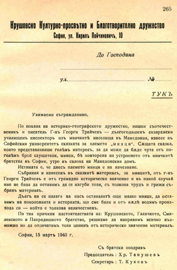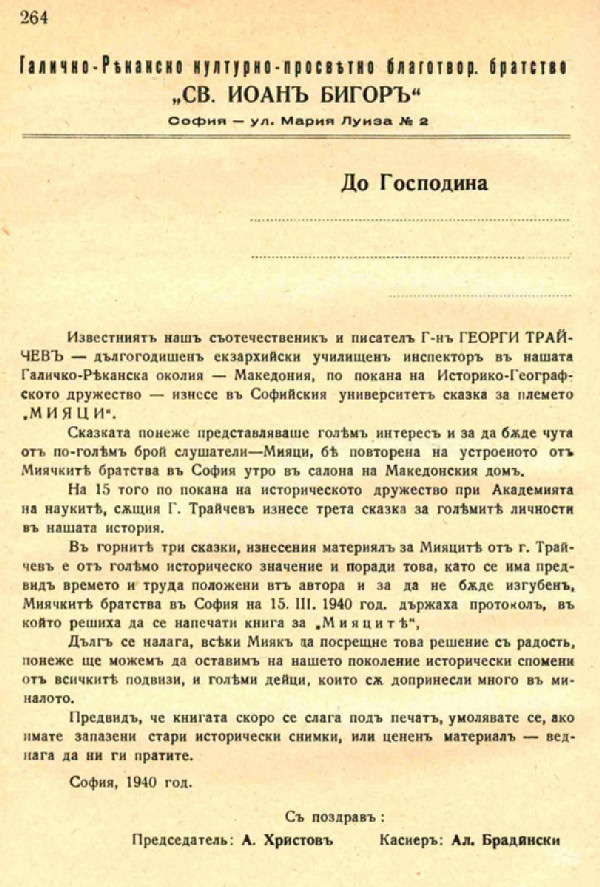 Известниятъ нашъ съотечественикъ и писателъ Г-нъ ГЕОРГИ ТРАЙЧЕВЪ — дългогодишенъ екзархийски училищенъ инспекторъ въ нашата Галичко-Рѣканска околия — Македония, по покана на Историко-Географското дружество — изнесе въ Софийския университетъ сказка за племето „Мияци".