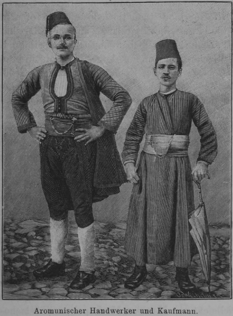 на овчаритѣ, макаръ и при тѣхъ да се срѣща, че взематъ носията и на други народности; така напр. образа въ стр. 64 момчето на лѣво има носията на тоскитѣ, а онова на дѣсно — на гегитѣ, макаръ и двѣтѣ да сѫ аромѫне отъ едно и сѫщо село. Занаятчиитѣ изъ градоветѣ оставатъ настрана своето национално облѣкло и носятъ кѫси гащи (ширвѫри), търговцитѣ се обличатъ въ дълга и нашарена риза (антериу, андриу, съие) отъ памучно платно, която по срѣдата се опасва съ поясъ и на него се туря дивита (каламара). Вьрху това носятъ сукнена дреха, подплатена съ кожа изцѣло или само по крайщата. Сѫщо тъй ходятъ и българскитѣ и еврейскитѣ търговци.