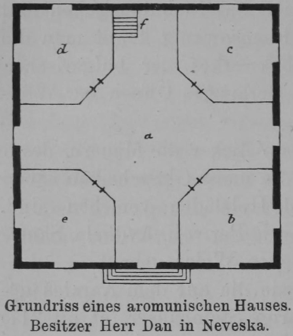 Ако мѣстото е малко по стръмнината, тѣ си изграждатъ кѫщата на високо, но не и въ ниско мѣсто. Основната форма на кѫщитѣ е повечето квадратна; покрива съ своитѣ тежки плочи прѣдставлява низка пирамида, а ако тя е построена върху правоѫгъленъ четириѫгълникъ, плоскоститѣ отъ кѫсия върхъ се спущатъ къмъ четиртѣхъ страни. Двоестраненъ покривъ съ ръбове видехъ само при българетѣ и гърцитѣ, сѫщо тъй непознаватъ и отворени галерии въ първия етажъ, както въ българскитѣ кѫщи — климата забранява подобенъ отворъ на жилищата.