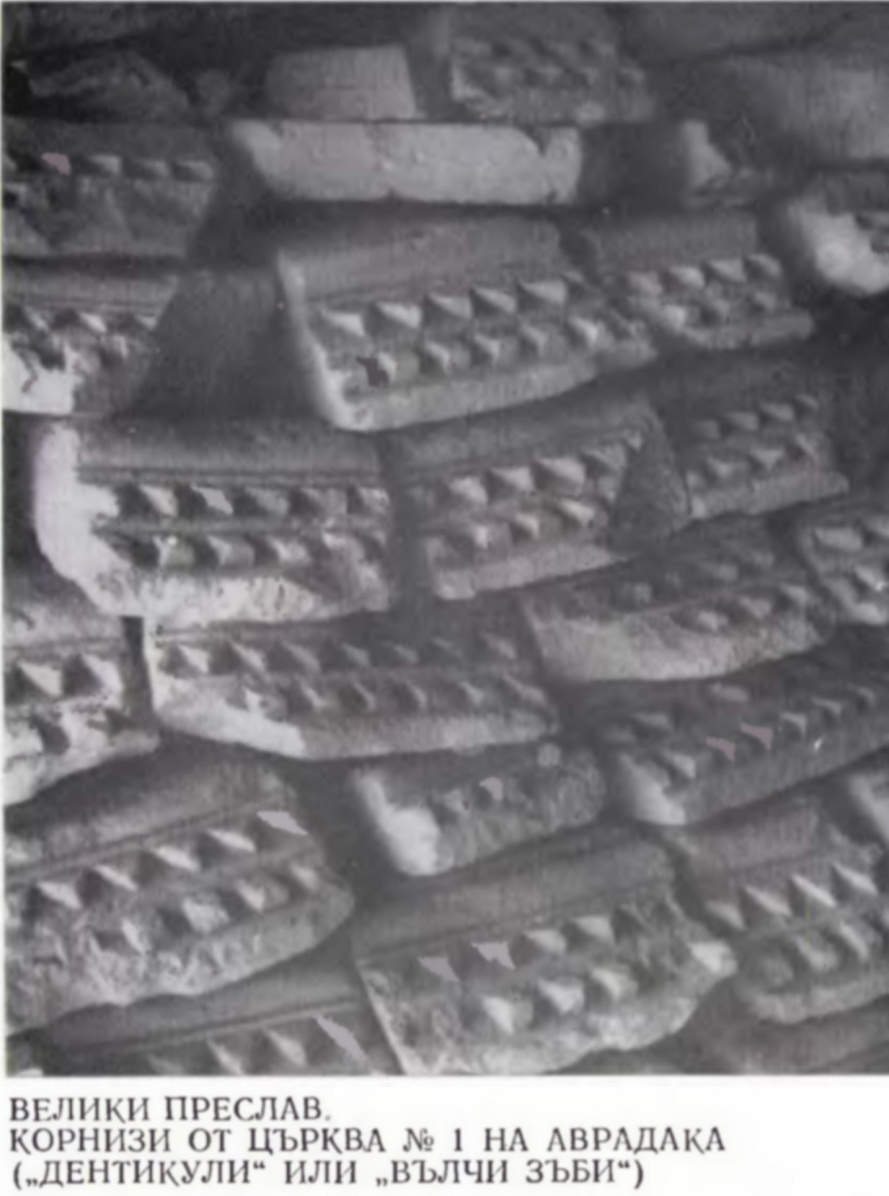 ВЕЛИКИ ПРЕСЛАВ. КОРНИЗИ ОТ ЦЪРКВА № 1 НА АВРАДАКА („ДЕНТИКУЛИ" ИЛИ „ВЪЛЧИ ЗЪБИ")