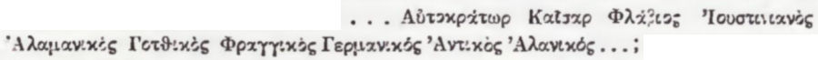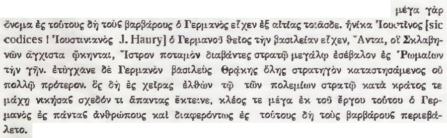 Един от първите издатели на Прокопиевите творби, йезуитът Claudius Maltretus (издал съчиненията му през 1661—1663 г. в Париж ; вж. повече у J. Haury, Prolegomena, I, p. LV), предложил да се чете на това място не името на император Ἰουστῖνος, както стои във всички ръкописи, но Ἰουστινιανός, и неговото четене е било възприето и от последния издател J. Haury. Против тази необоснована поправка се обяви L. Niederle в Česky časopis historicky, 1905, p. 136 ; SS, ib., pp. 191—194; Manuel, ib., p. 63 n. 3. Чешкият учен се позовава, на първо място, на единогласието на всички ръкописи в указването името на Юстин. Думата θεῖος може според него да означава „чичо” или „вуйчо” от първа и втора степен; така тази дума е могла да изразява родството на Герман както към Юстиниан I, негов чичо от първа степен, така и към Юстин I, чичо от втора степен. Доколкото има сведения за живота на Герман (починал според Procopius, ib., II, p. 477, 10 sqq. през 550 г.; други сведения за него са събрани у Niederle, SS, ib., p. 192 n. 2), през царуването на Юстин I той е бил вече на такава възраст, че можел да бъде назначен за стратег на войските в Тракия. Той е воювал със славяните наскоро след назначението си на тази длъжност. Ако Прокопий е писал 7-те книги от това свое произведение през 550—551 г. (вж. Niederle , ib., p. 181, n. 2), значи още през царуването на имп. Юстиниан I, то ясно е, че той не би могъл да пише : ἡνίκα ὁ Ἰουστινιανὸς ... τὴν βασιλείαν εἴχεν : „когато Юстиниан царуваше” (букв.: „имаше царската власт”.) Най-сетне, ако това събитие е станало по времето на Юстиниан I, чието царуване описва Прокопий, то той не би пропуснал поради неговата важност да го упомене. В допълнение на това H. Kallenberg, Germanus Justinians Vetter, nicht Neffe (Berl. philol. Wochenschrift, 35 (1915), coll. 991—992) (срв. Byzantinische Zeitschrift, XXIII (1920), p. 423), доказа, че Герман е бил братовчед на Юстиниан I, не негов племенник, поради което в текста трябва да се чете Ἰουστῖνος, а не Ἰουστινιανός. Срв. още Jиречек, Историја Срба, I, с. 58 ; Еnsslin, op. c., col. 698 ; Державин, п. с., c. 24, няма пред вид поправката на текста.