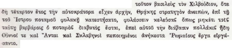 пълководец Герман : „Герман имаше голямо име между тези варвари поради следната причина: когато Юстин, Германовият чичо, управляваше, антите, които обитават близко до славяните, преминаха Дунава с голяма войска (στρατῷ μεγάλῳ) и нахлуха в земята на ромеите. Случи се, че немного преди това (οὐ πολλῷ πρότερον) императорът бе назначил за стратег на цяла Тракия [10] Герман, който влезе в сражение с вражеската войска и като я победи всемощно в сражение, изби почти всички. От това дело Герман си придоби голяма слава всред всички люде и особено между тези варвари.” [11] Не е известна