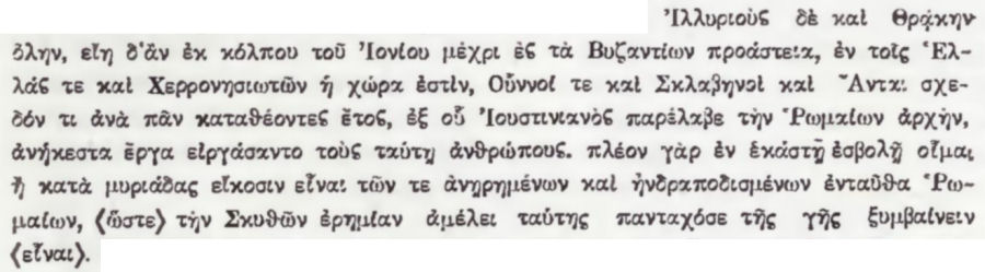 противоречива мисъл. Явно е, че той е желаел само да изтъкне зачестяването и засилването на славянските нападения по времето на Юстиниан. Тези нападения тук са съпоставени и свързани с другите бедствия, които постигнали империята през царуването на този владетел. Ако се съди по някои други указания на Прокопий за местата на славянските нападения в покъсно време, думите, че славяните нападали в земите от Адриатическо море до Цариград, съвсем не изглеждат преувеличени.