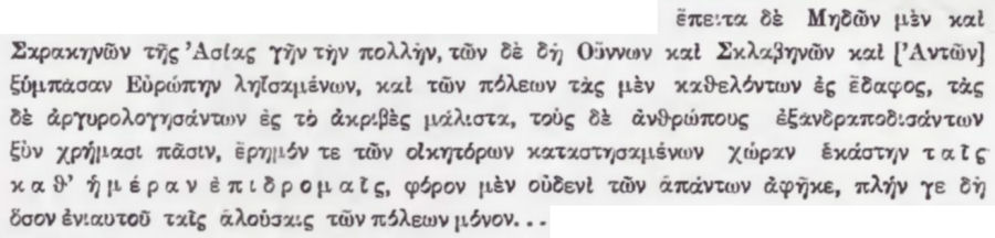 „В това опустошение те прекараха продължително време и изпълниха всички пътища с трупове, заробиха неизчислими множества и всичко опустошиха,