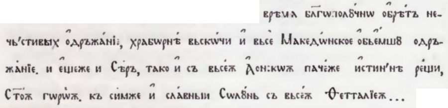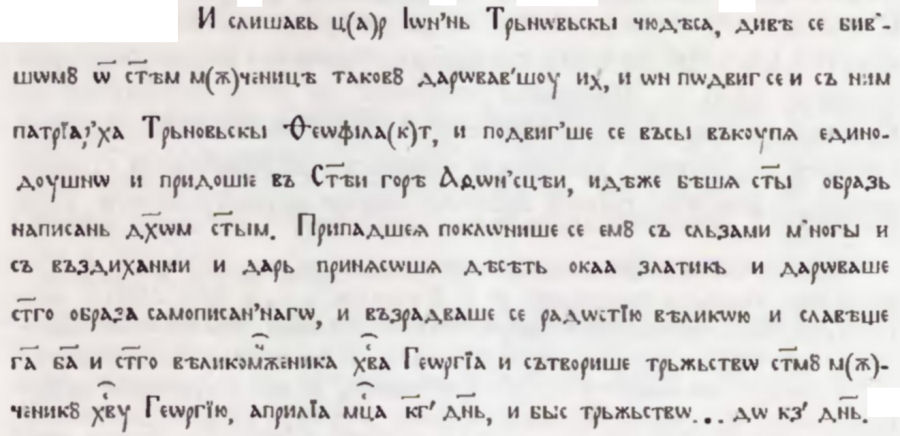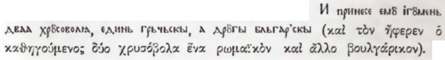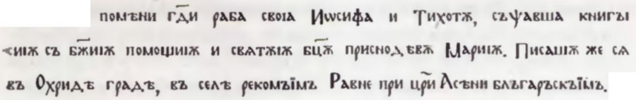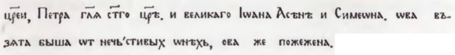 98. Вж. Б. Цонев, История на българский език. А. Обща част, т. I. (София 1940), с. 176—178. Любопитно е, че в една приписка (вж. Цонев, п. с., с. 177) се споменава личното име Стрѣѕо ; за него вж. Π. Мутафчиев, Владетелите на Просек. СбБАН, I (1913), с. 44 сл. ; Златарски, п. с., с. 270 сл.