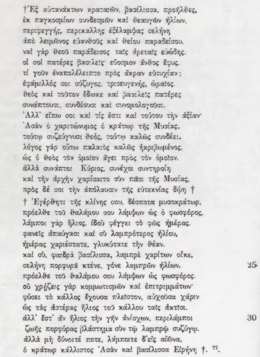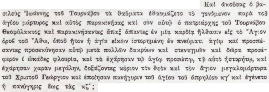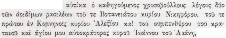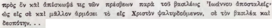 Μηλιαράκης, op. c. p. 255, погрешно отъждествява споменатия тук βασιλεὺς Ἰωάννης с Иван Асен II, когато в същност с това име се указва имп. Йоан III Ватаци (срв. G. Acropolita, ib., pp. 34,20 ; 36, 10, 16; 38, 7 ; 40, 3 ; 45. 5 passim). За думите σὲ τὸν βασιλέα καὶ δεσπότην A. Ηeisenberg не е забелязал, че са цитат из църковен химн и са били отъждествени още от Μηλιαράκης, ор. с., р. 255, л. 1.