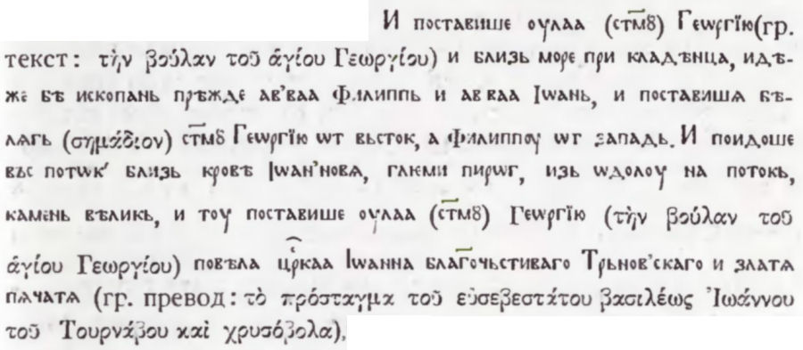 44. Иванов, п. с., c. 545 ; в гръцкия превод тази част е нечетлива ; срв. Gelzer, ib., p. 529 ad I. 218: Es folgen vier völlig erloschene Zeilen; Соловjeв—Мошин, п. с., c. 372, напротив, съобщават, че тази част липсвала в гръцкия превод.