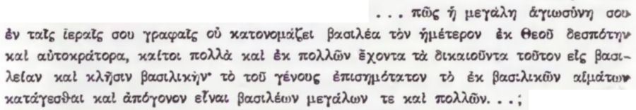 — Лошо тълкуване е дадено от Златарски, п. с., с. 354 и бел. 2, на думите от писмото на навпактския митрополит Йоан (Виз. врем., III [1896] с. 292, 30—35) : става дума за това, че латинският цариградски император (ὁ ἀζυμίτης) се назовавал βασιλεύς, че Иван Асен II също се е назовавал в свои писма (ἐν γράμμασι) βασιλεὺς ὑψηλότατος, а се пренебрегвало и не се признавало царското звание на онзи, който „получил право на царска власт от своите предци“ (ὁ τὸ δικαίωμα τῆς βασιλείας ἐκ προγόνων λαβών, не „който е получил законно основание...“) и справедливо (δικαίως) бил призван (καλούμενος) на нея (εἰς αὐτἡν), сиреч бил позован да я заеме (не „справедливо се нарича с нея" !). В тези думи прочее няма никакъв намек, който би оправдал предположението на Златарски, п. с., с. 355, 360, 366, че сам никейският патриарх „славил и величаел в писмата си българския цар Иван Асен II за височайши цар (василевс)“ и следователно още в 1228 г. е имало между тях някакви преговори. Тогава би трябвало да се заключи, че патриархът е признавал титлата βασιλεὺς и на латинския цариградски император.