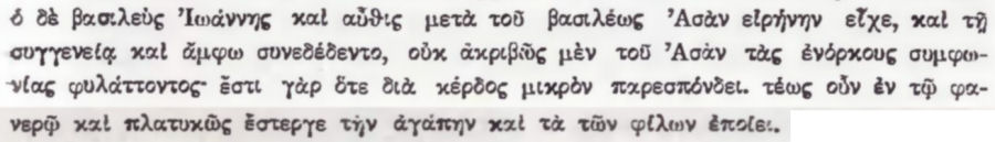 Срв. Ephraemius, ib., vv. 8325—26 : ὁ δ᾿ Ἀσάνης ἔστεργε συμβάσεις τέως | εἰ μὴ καθαρῶς, ἀλλὰ τὸ πλέον μέρος. Проф. Златарски, п. с., c. 403, погрешно е отнесъл това към други събития, именно възобновата на съюза с Йоан Ватаци в края на 1237 г. ; даден е неточен превод, който изменя напълно смисъла на текста: „Макар императорът и да сключил пак съюз с Асеня и се съединил с него чрез роднински връзки, но Асен не твърде точно спазвал клетвените договори — той бил готов да ги наруши при най-малката изгода. Изобщо той само на вид и лицемерно показвал обич и изпълнявал приятелските задължения." За πλατυκῶς (не „лицемерно", а „circiter, in universum") вж. Heisenberg, ib., p. 327; към това указание С. Шестаков: Виз. врем., IX (1904), с. 642, прибавя още думите : τὰ μὲν πλχτυκώτερον τὰ δὲ ἰδικώτερόν τε καὶ μερικώτερον (в надгробната реч на Йоан III Ватаци от G. Acropolita, Opera, II, p. 21, 10—11), гдето „смысль слова особено ясен по противопоставление с ἰδικώτερον". Срв. латинския превод в бонското издание (р. 65): imperator vero Ioannes rursus cum Asano pacem sanxit, et affinitate ambo vinciebantur . . . Лошото тълкуване на думите αὖθις μετὰ τοῦ βασιλέως Ἀσὰν εἰρήνην εἶχε е накарало Златарски, п. c., c. 403 (срв. и Dölger, Regesten, nr. 1758) да отнесе това сведение към възобновата на мира между българи и никейци в края на 1237 г. Изразът εἰρήνην εἶκε означава „имаше (поддържаше) мир“ и не дава указание за някакво скъсване и подновяване на мирните отношения.
