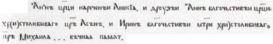 — В Синодика между црцѧ блъгарскыѧ се споменава на първо място майката на Иван Асен II и жена на Асен I, царица Елена (вж. изд. М. Попруженко, с. 88. § 117), а след това (§ 118) се добавя :